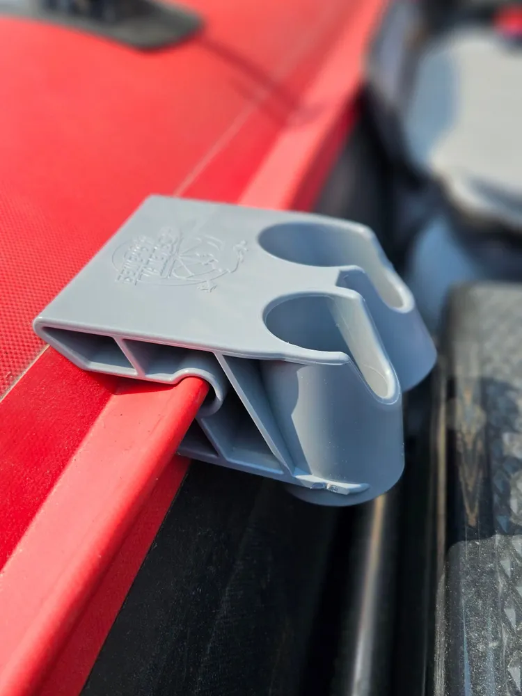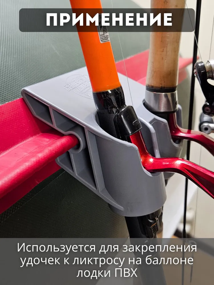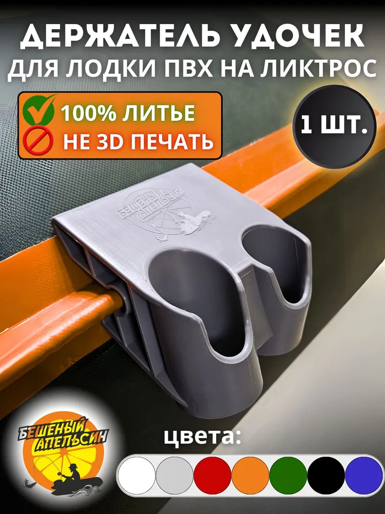 Держатель удочки двойной на ликтрос надувной лодки от торговой марки «Бешеный Апельсин». Это держатель с двумя разнонаправленными отверстиями. В отличие от одинарного держателя, с этим держателем можно заниматься троллингом за счёт увеличенной ширины до 10 см.