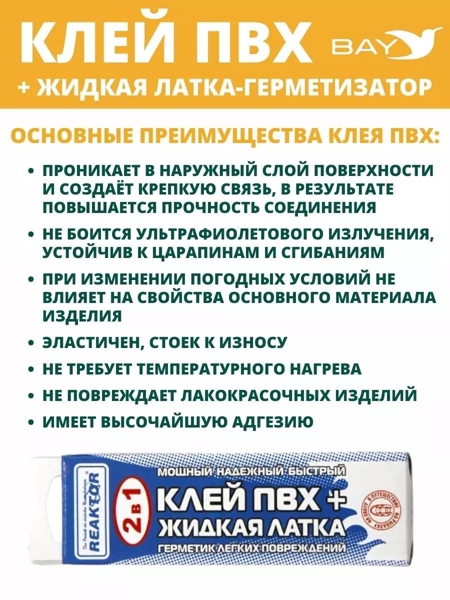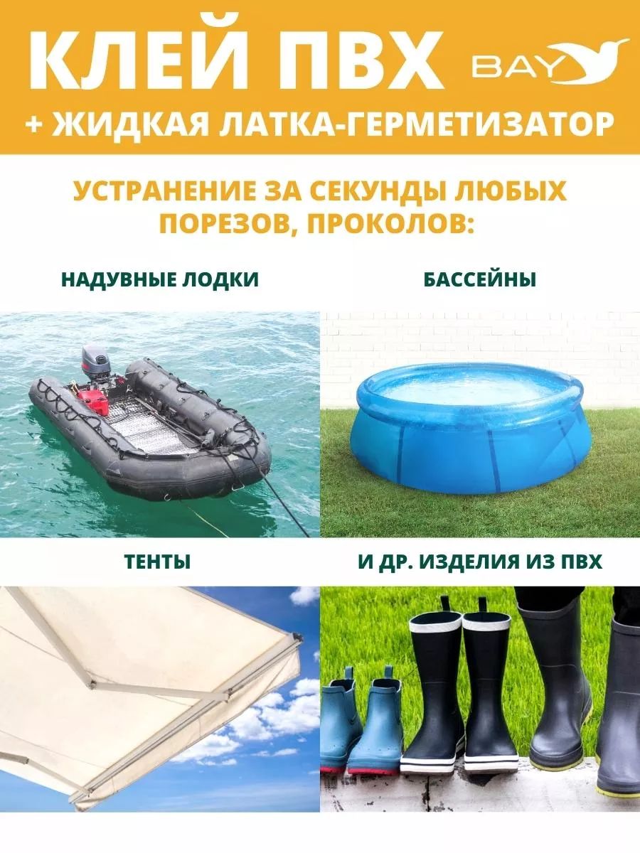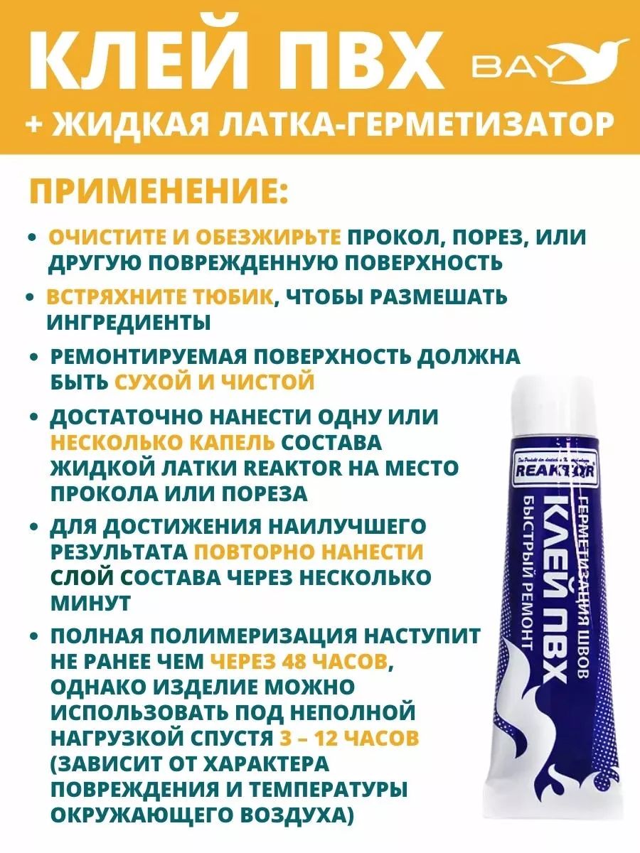 2 в 1: жидкая латка-герметизатор (быстрая заплатка – герметизатор швов) – это специально разработанный продукт от немецкой компании Reaktor, который предназначен для оперативного ремонта надувных лодок, бассейнов, тентов и др. изделий из тканей ПВХ. Современный полимер представляет собой композиционный состав полиуретановых смол, активаторов, ускорителей и стабилизаторов. Полная полимеризация наступает через 24 часа, однако использовать изделие под неполной нагрузкой можно спустя 1 – 12 часов в зависимости от характера повреждения и температуры окружающего воздуха. Преимущества: Клей ПВХ предназначен для оперативного ремонта! До полной полимеризации не накачивайте лодку и другие надувные изделия, используемые на воде, до максимально рекомендованного значения, а накачайте по возможному минимуму лишь для поддержания ее на плаву! Избегайте эксплуатации лодки при температуре свыше 40 градусов цельсия! При ремонте лодок и других надувных изделий, используемых на воде, периодически проверяйте герметичность отремонтированных повреждений! Вся продукция компании Reaktor упакована в дорогие алюминиевые тубы, что предотвращает преждевременную полимеризацию и высыхание. по мере использования подворачивайте «хвостик» тюбика, удаляя лишнее воздушное пространство. Быстрый ремонт, спасатель в сложных ситуациях, ремкомплект в походе отпуске кемпинге сплав лодка палатка велосипед шина.