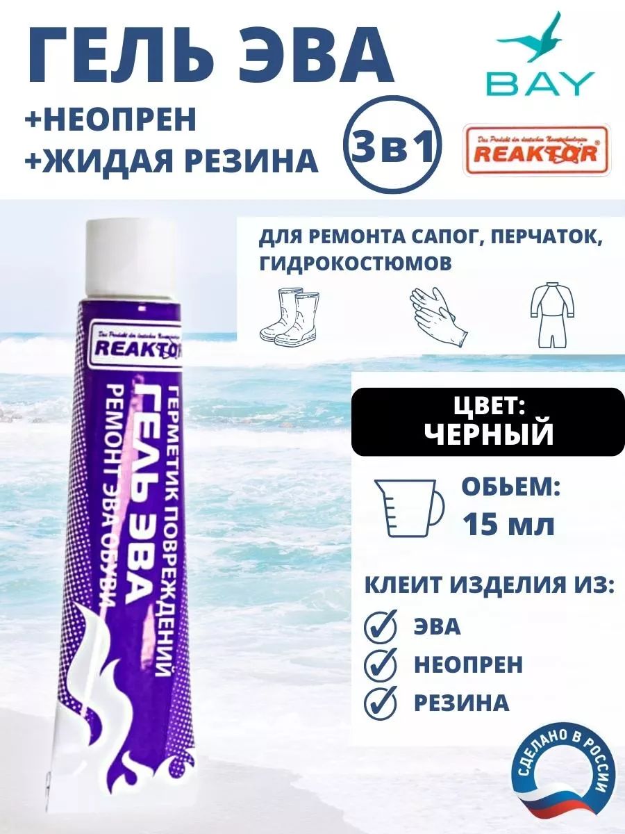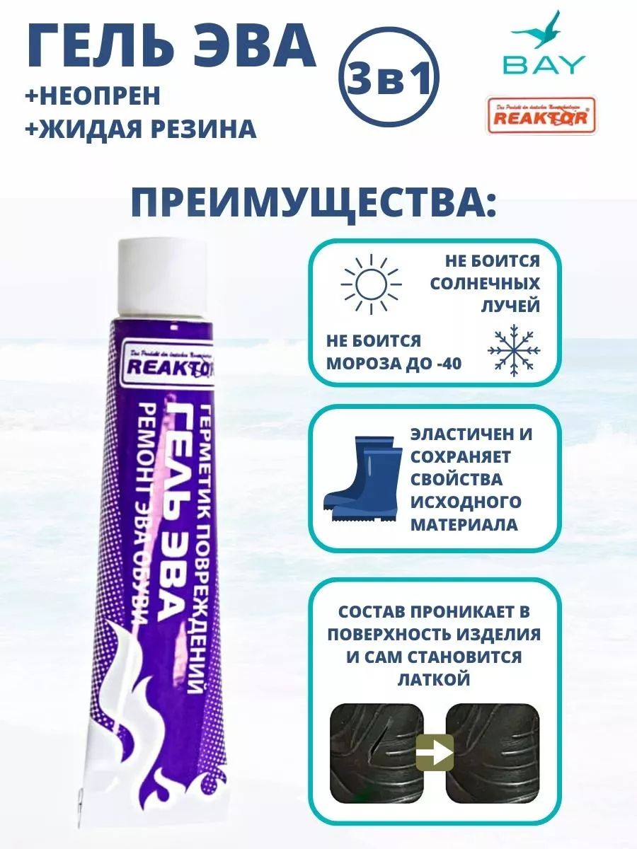 Гель ЭВА ( гелевая заплатка – гермитизатор проколов и порезов эва обуви) – специально разработанный продукт от компании Реактор, для ремонта обуви из ЭВА материалов. Современный полимер Гель ЭВА представляет собой композиционный состав полиуретановых композитов, активаторов, ускорителей и стабилизаторов. Цвет: хаки. ИНСТРУКЦИЯ ПО ПРИМЕНЕНИЮ: Расточите прокол надфилем до 2 – 3 мм., а порез зачистите наждачной бумагой, или другим абразивом, удалив наружный и внутренний гладкие слои на 0,2 - 0,5 мм. очистите и обезжирьте прокол, порез, или другую поврежденную поверхность активатором Реактор, который гарантировано поможет достичь максимально возможную адгезию Геля ЭВА с эва материалами. В случае отсутствия активатора допустимо использовать любой спирто -, или ацетоно- содержащий растворитель, однако 100% результат в этом случае не гарантирован. 10 – 15 раз встряхните тюбик, чтобы размешать ингредиенты. Нанесите Гель на каждую сторону пореза, или повреждения, подождите 15 мин. и плотно прижмите склеиваемые части друг к другу. Ремонт прокола: расточите прокол надфилем до 2–3 мм., оставьте ручку надфиля в повреждении, со стороны подошвы сапога нанесите Гель ЭВА на прокол и медленно вытягивайте надфиль со стороны голенища. В этом случае, надфиль работает как поршень в медицинском шприце, и затянет Гель ЭВА вглубь повреждения, или плотно забейте гелем прокол с помощью зубочистки или спички. Полная полимеризация наступит через 72 часов. Ремонт, спасатель, помощник в походе, отдыхе, даче, кемпинг.
