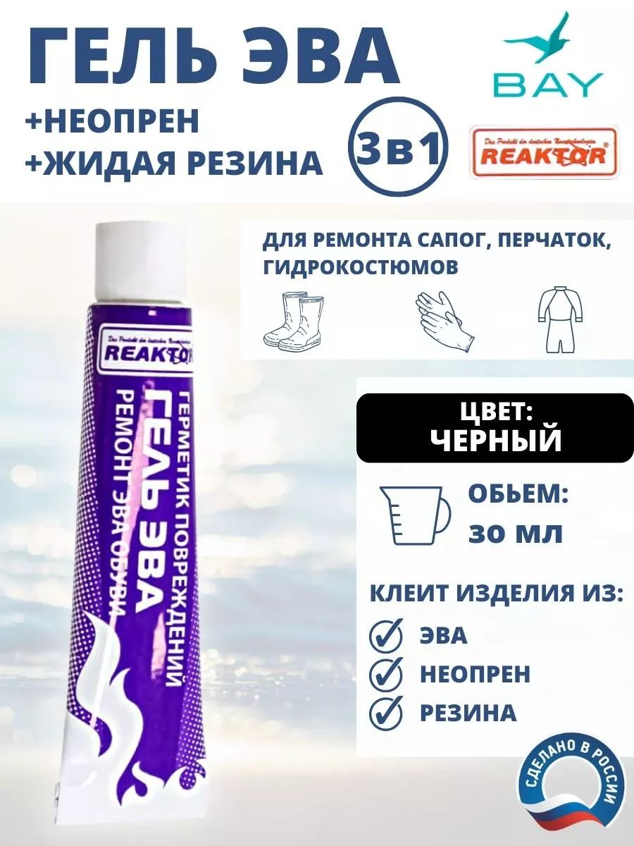 Гель ЭВА ( гелевая заплатка – гермитизатор проколов и порезов эва обуви) – специально разработанный продукт от компании Реактор, для ремонта обуви из ЭВА материалов. Современный полимер Гель ЭВА представляет собой композиционный состав полиуретановых композитов, активаторов, ускорителей и стабилизаторов. Цвет: хаки. ИНСТРУКЦИЯ ПО ПРИМЕНЕНИЮ: Расточите прокол надфилем до 2 – 3 мм., а порез зачистите наждачной бумагой, или другим абразивом, удалив наружный и внутренний гладкие слои на 0,2 - 0,5 мм. очистите и обезжирьте прокол, порез, или другую поврежденную поверхность активатором Реактор, который гарантировано поможет достичь максимально возможную адгезию Геля ЭВА с эва материалами. В случае отсутствия активатора допустимо использовать любой спирто -, или ацетоно- содержащий растворитель, однако 100% результат в этом случае не гарантирован. 10 – 15 раз встряхните тюбик, чтобы размешать ингредиенты. Нанесите Гель на каждую сторону пореза, или повреждения, подождите 15 мин. и плотно прижмите склеиваемые части друг к другу. Ремонт прокола: расточите прокол надфилем до 2–3 мм., оставьте ручку надфиля в повреждении, со стороны подошвы сапога нанесите Гель ЭВА на прокол и медленно вытягивайте надфиль со стороны голенища. В этом случае, надфиль работает как поршень в медицинском шприце, и затянет Гель ЭВА вглубь повреждения, или плотно забейте гелем прокол с помощью зубочистки или спички. Полная полимеризация наступит через 72 часов. Ремонт, спасатель, помощник в походе, отдыхе, даче, кемпинг.