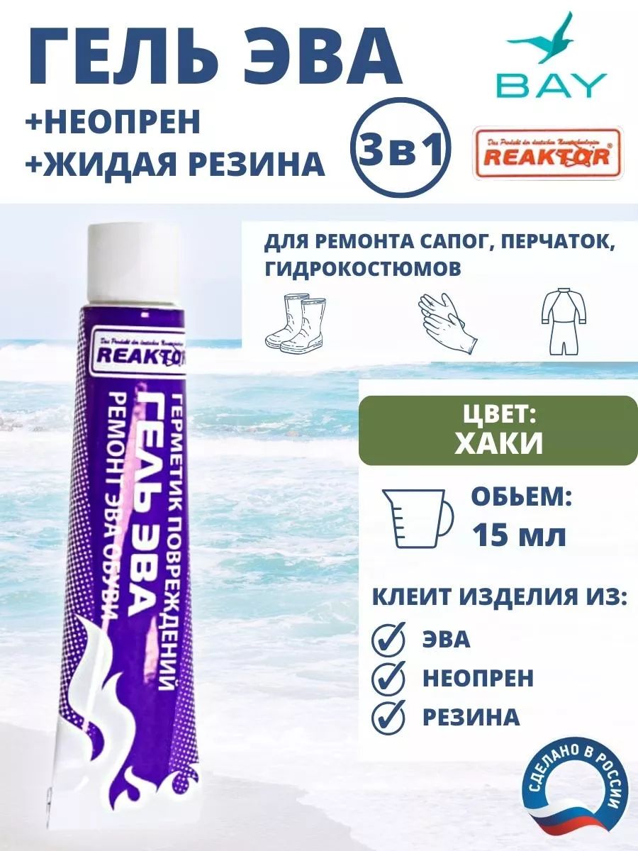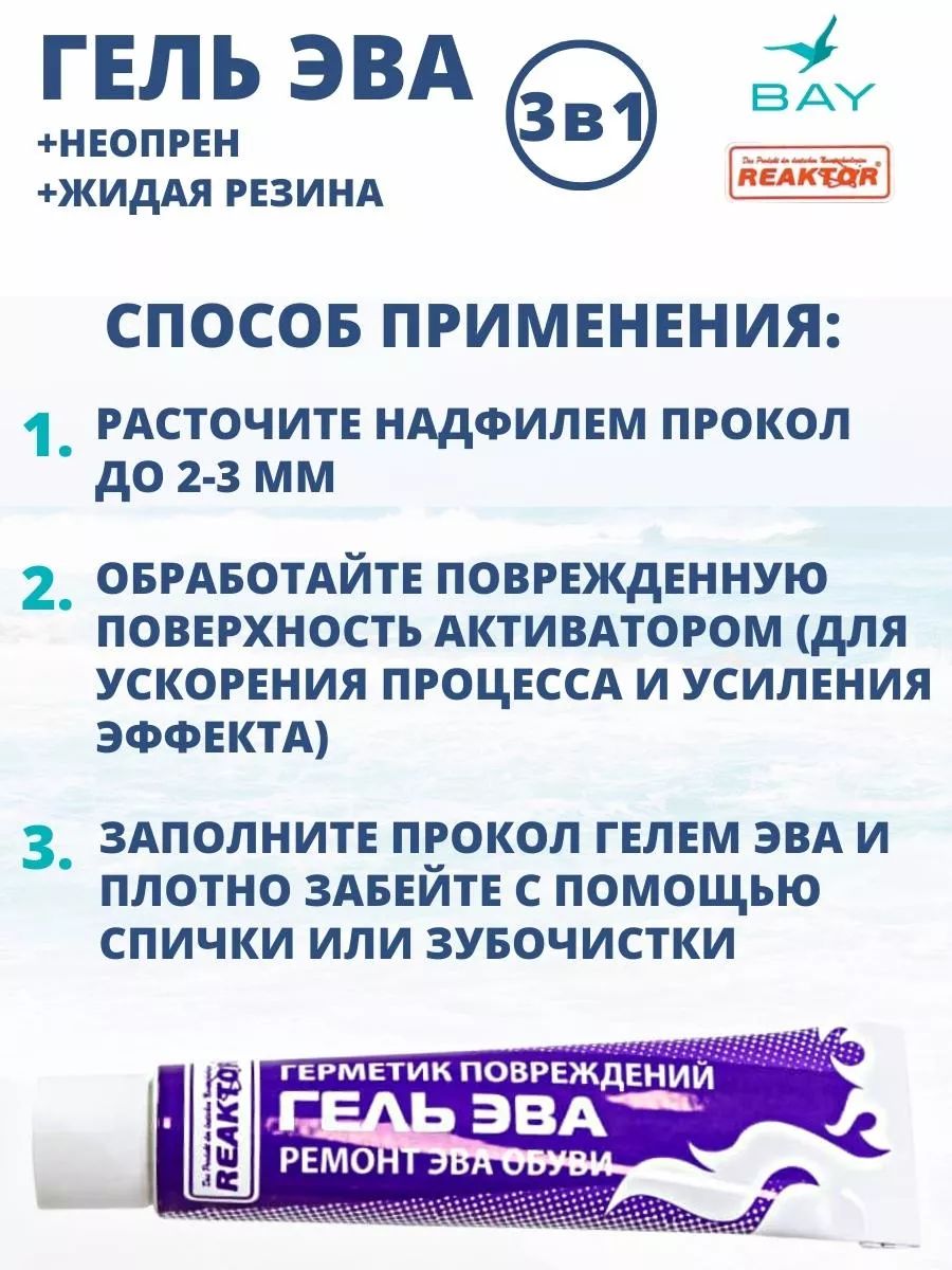 Гель ЭВА ( гелевая заплатка – гермитизатор проколов и порезов эва обуви) – специально разработанный продукт от компании Реактор, для ремонта обуви из ЭВА материалов. Современный полимер Гель ЭВА представляет собой композиционный состав полиуретановых композитов, активаторов, ускорителей и стабилизаторов. Цвет: хаки. ИНСТРУКЦИЯ ПО ПРИМЕНЕНИЮ: Расточите прокол надфилем до 2 – 3 мм., а порез зачистите наждачной бумагой, или другим абразивом, удалив наружный и внутренний гладкие слои на 0,2 - 0,5 мм. очистите и обезжирьте прокол, порез, или другую поврежденную поверхность активатором Реактор, который гарантировано поможет достичь максимально возможную адгезию Геля ЭВА с эва материалами. В случае отсутствия активатора допустимо использовать любой спирто -, или ацетоно- содержащий растворитель, однако 100% результат в этом случае не гарантирован. 10 – 15 раз встряхните тюбик, чтобы размешать ингредиенты. Нанесите Гель на каждую сторону пореза, или повреждения, подождите 15 мин. и плотно прижмите склеиваемые части друг к другу. Ремонт прокола: расточите прокол надфилем до 2–3 мм., оставьте ручку надфиля в повреждении, со стороны подошвы сапога нанесите Гель ЭВА на прокол и медленно вытягивайте надфиль со стороны голенища. В этом случае, надфиль работает как поршень в медицинском шприце, и затянет Гель ЭВА вглубь повреждения, или плотно забейте гелем прокол с помощью зубочистки или спички. Полная полимеризация наступит через 72 часов. Ремонт, спасатель, помощник в походе, отдыхе, даче, кемпинг.
