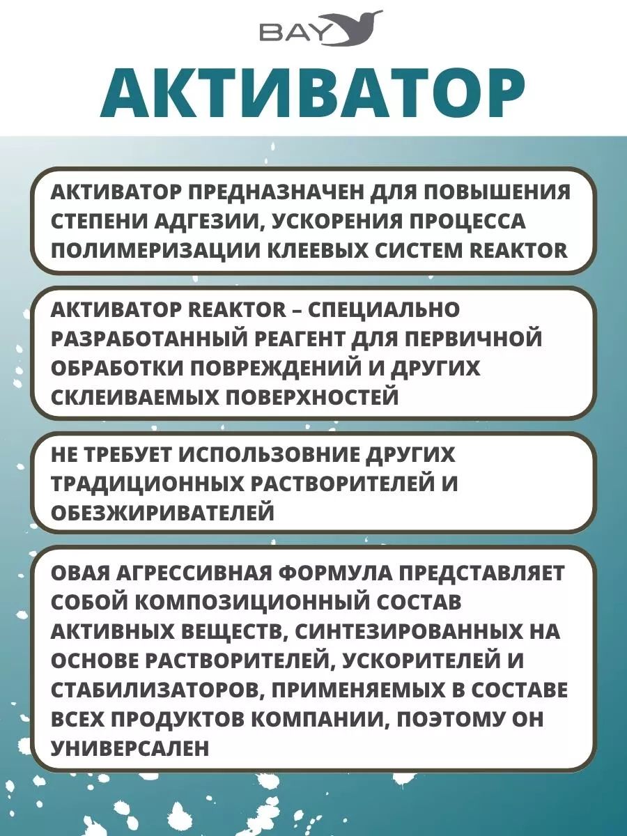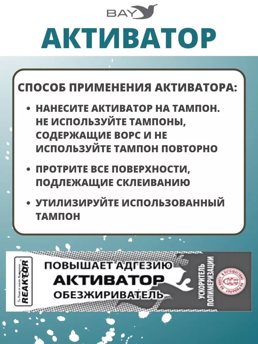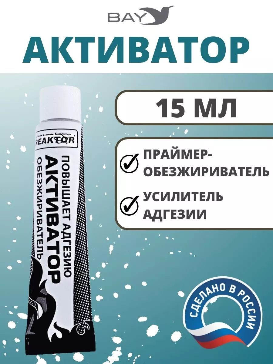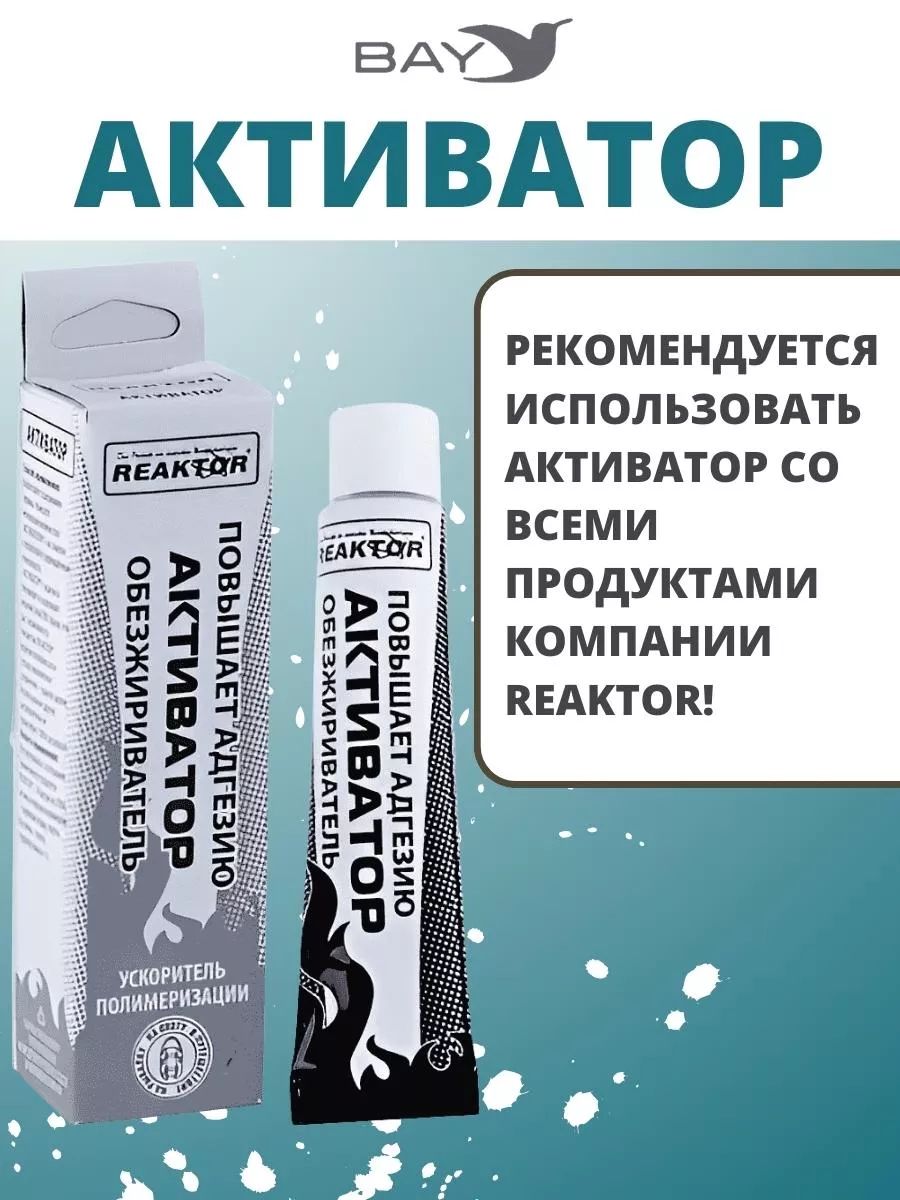Активатор, 15мл., Реактор - повышает степень адгезии, ускоряет процесс полимеризации- специально разработанный реагент от компании Реактор для первичной обработки повреждений и других склеиваемых поверхностей. Новая агрессивная формула представляет собой композиционный состав активных веществ, синтезированных на основе растворителей, ускорителей и стабилизаторов, применяемых в составе всех продуктов компании, поэтому он универсален. Почтой активатор НЕ высылаем. Доставка по Минску 10 рублей или самовывоз!!! Запрещается работать без средств индивидуальной защиты: очков, полиэтиленовых перчаток! Обязательно беречь глаза, кожу от попадания клея ультра! При попадании промыть под струей большим количеством воды и обратиться к врачу! Рекомендуется использовать с продуктами компании Реактор: гель ПВХ; жидкий ПВХ; гель ЭВА; клей Ультра; клей ПВХ; клей Резина. Способ применения: Для достижения наилучшего результата: Нанесите активатор на тампон. Не используйте тампоны, содержащие ворс и не используйте тампон повторно. Протрите все поверхности, подлежащие склеиванию. Утилизируйте использованный тампон. Ремонт, спасатель в походе, ремкомплект.