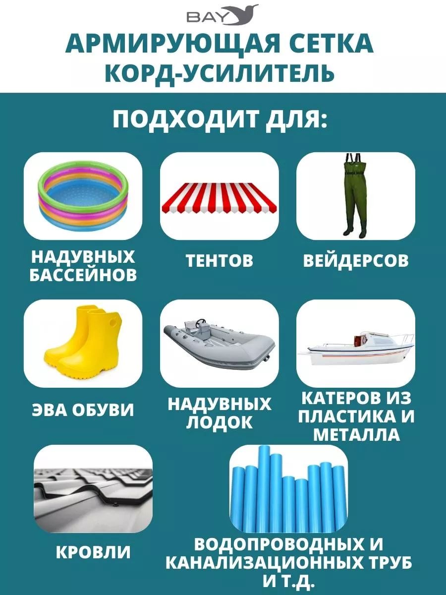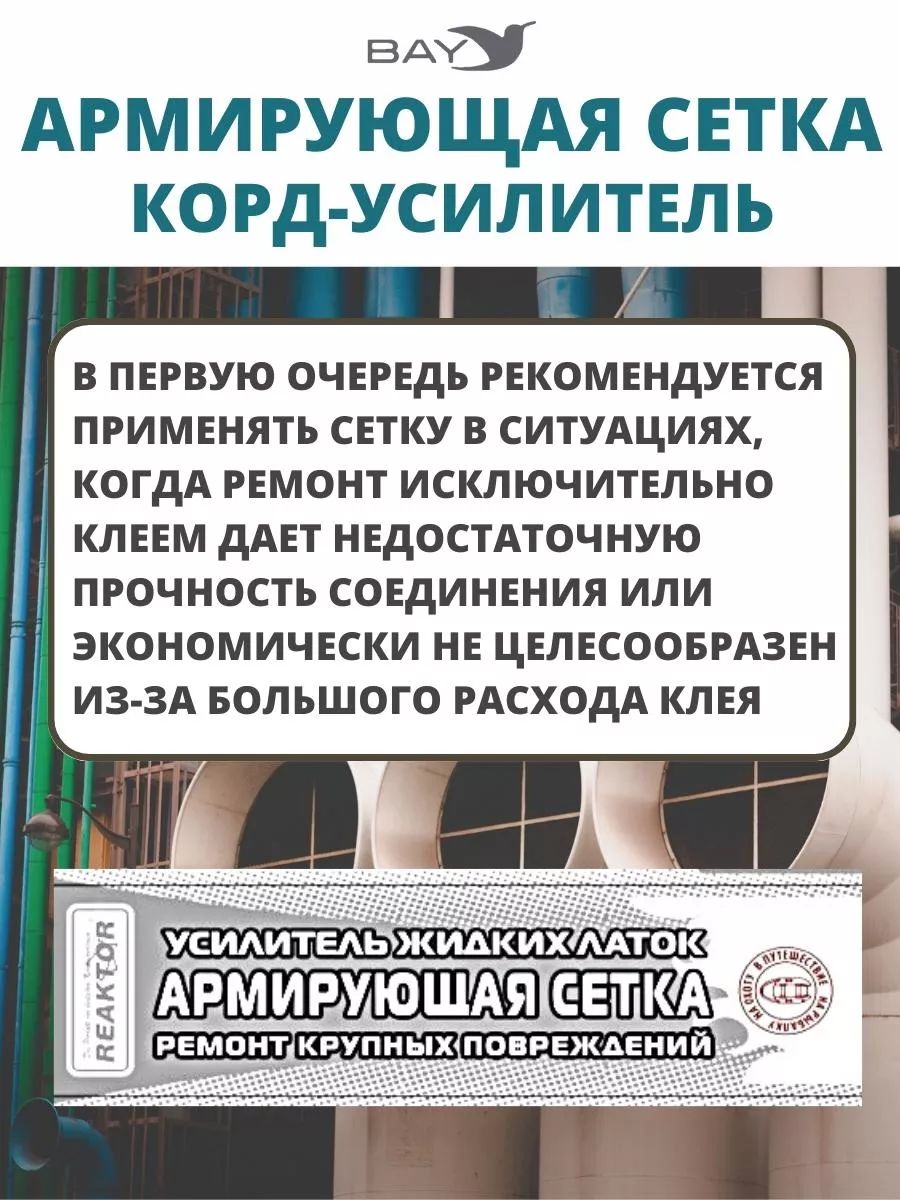 Армирующий корд для изделий из ПВХ - армирующее волокно можно использовать в случае значительных повреждений изделия. Если Вы используете армирующий корд, то уже нет необходимости дополнительно сшивать изделие. Для выполнения ремонта необходимо три простых шага: Обезжирить поверхность и корд. Наложить корд на ремонтируемую поверхность (порез). Нанести Жидкую Латку. При необходимости нанести второй слой латки