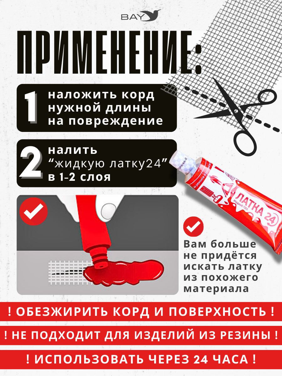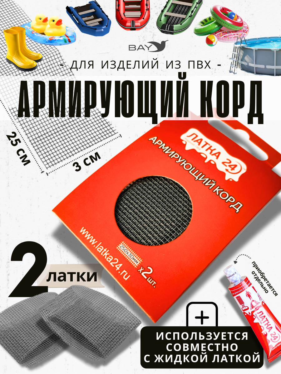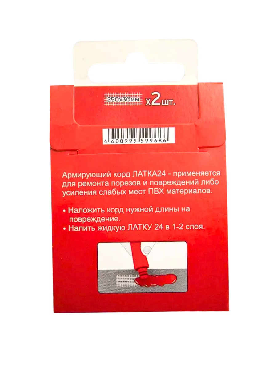 Армирующий корд для изделий из ПВХ - армирующее волокно можно использовать в случае значительных повреждений изделия. Если Вы используете армирующий корд, то уже нет необходимости дополнительно сшивать изделие. Для выполнения ремонта необходимо три простых шага: Обезжирить поверхность и корд. Наложить корд на ремонтируемую поверхность (порез). Нанести Жидкую Латку. При необходимости нанести второй слой латки