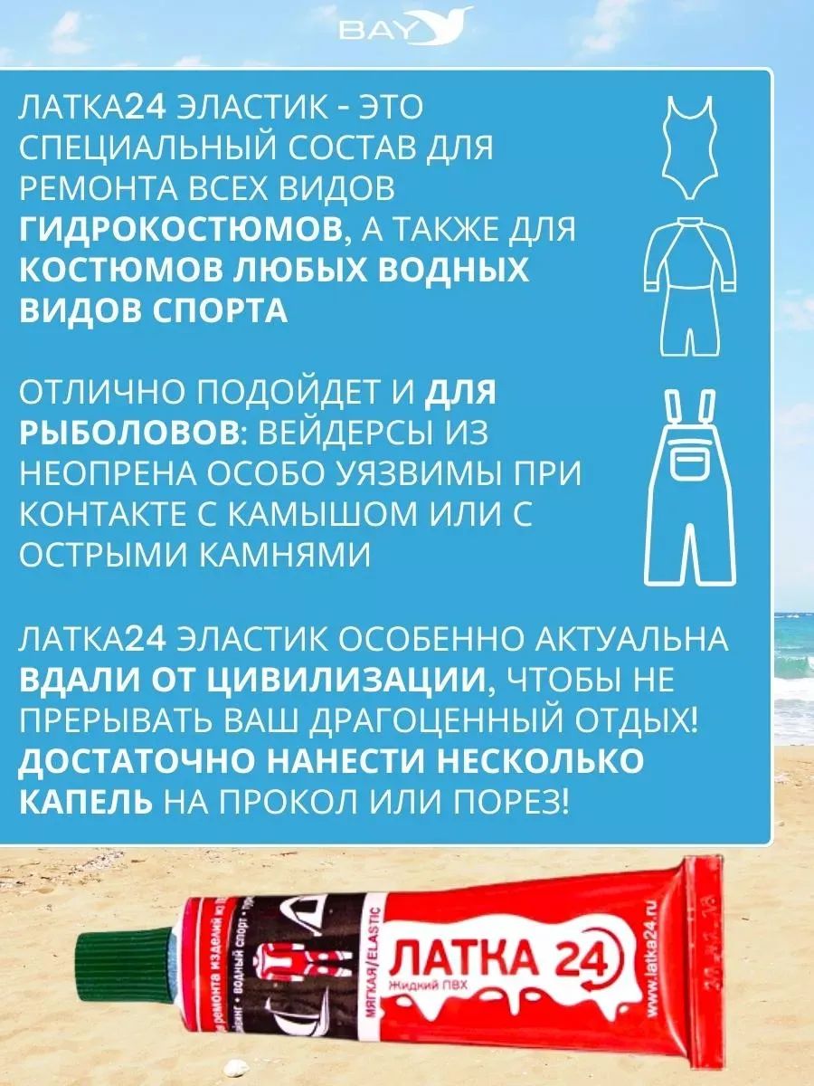 Латка 24 эластик- это специальный состав для ремонта всех видов гидрокостюмов, а также для костюмов любых водных видов спорта. Отлично подойдет и для рыболовов: вейдерсы из неопрена особо уязвимы при контакте с камышом или с острыми камнями. Латка 24 Эластик особенно актуальна вдали от цивилизации, чтобы не прерывать Ваш драгоценный отдых! Достаточно нанести несколько капель на прокол или порез!