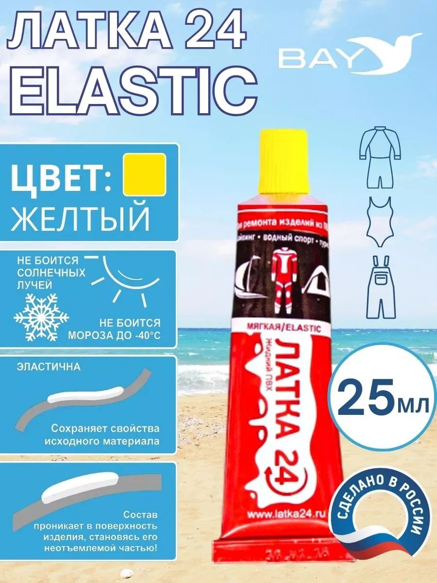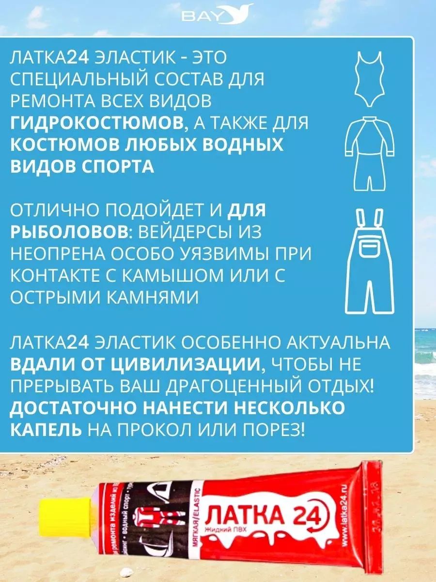 Латка 24 эластик- это специальный состав для ремонта всех видов гидрокостюмов, а также для костюмов любых водных видов спорта. Отлично подойдет и для рыболовов: вейдерсы из неопрена особо уязвимы при контакте с камышом или с острыми камнями. Латка 24 Эластик особенно актуальна вдали от цивилизации, чтобы не прерывать Ваш драгоценный отдых! Достаточно нанести несколько капель на прокол или порез!