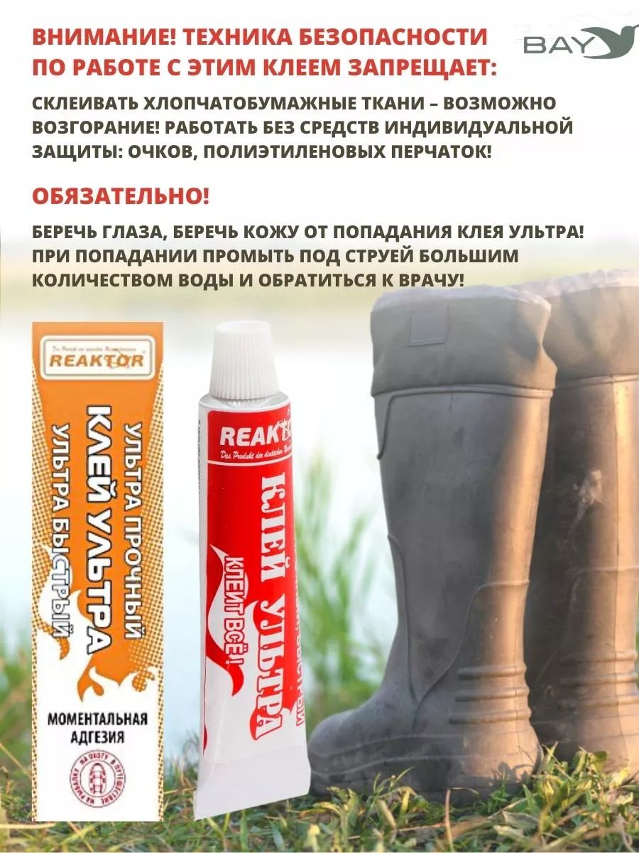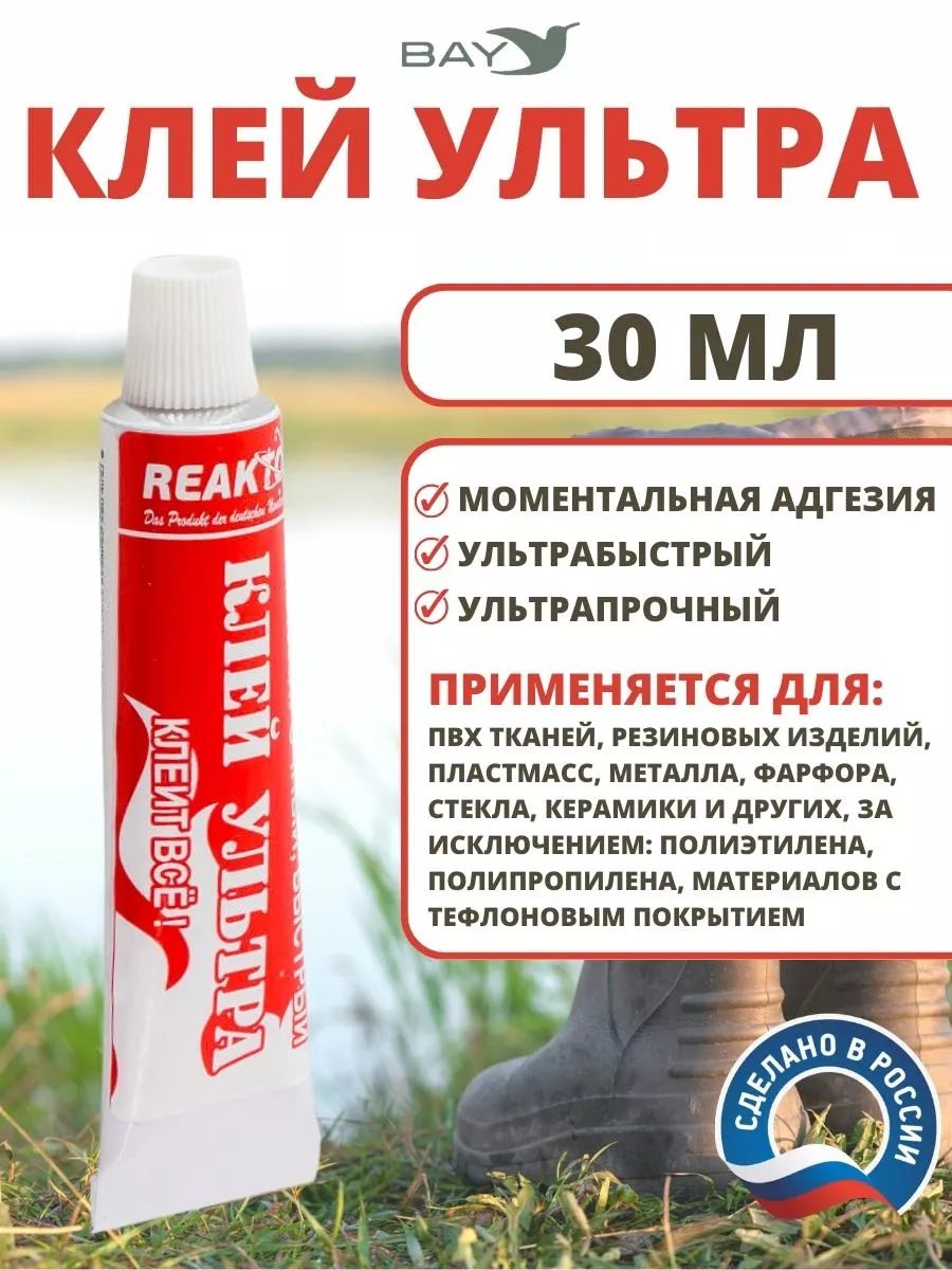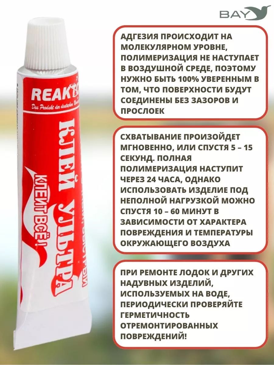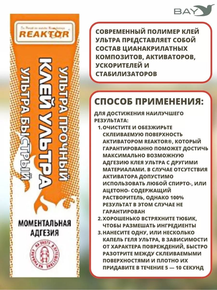Клей Ультра моментального действия ( ультрабыстрый, ультрапрочный) – специально разработанный продукт от компании Реактор для оперативного ультрапрочного и ультрабыстрого склеивания большинства материалов: пвх тканей, резиновых изделий, пластмасс, металла, фарфора, стекла, керамики и других, за исключением: полиэтилена, полипропилена, материалов с тефлоновым покрытием. Вся продукция компании Реактор упакована в дорогие алюминиевые тубы, что предотвращает преждевременную полимеризацию и высыхание. по мере использования подворачивайте «хвостик» тюбика, удаляя лишнее воздушное пространство. Запрещается: Работать без средств индивидуальной защиты: очков, полиэтиленовых перчаток! Инструкция: Очистить и обезжирить склеиваемую поверхность Активатором Реактор, который гарантированно поможет достичь максимально возможную адгезию клея ультра с другими материалами. В случае отсутствия активатора допустимо использовать любой спирта или ацетона содержащий растворитель, однако 100% результат в этом случае не гарантирован. Встряхните тюбик, чтобы размешать ингредиенты. Нанесите одну, или несколько капель клея в зависимости от характера повреждений, быстро разотрите между склеиваемыми поверхностями и плотно их придавите в течение 5-10 сек. Адгезия происходит на молекулярном уровне, полимеризация не наступает в воздушной среде, поэтому нужно быть 100% уверенным в том, что поверхности будут соединены без зазоров и прослоек. Схватывание произойдет мгновенно, или спустя 5– 15 сек. полная полимеризация наступит через 24 часа, однако использовать изделие под неполной нагрузкой можно спустя 10–60 минут в зависимости от характера повреждения и температуры окружающего воздуха. Применение: Рекомендуется использование отвердителя для полиуретановых клеев. Для обезжиривания поверхности, повышения степени адгезии и ускорения процесса полимеризации, рекомендуется использовать активатор.