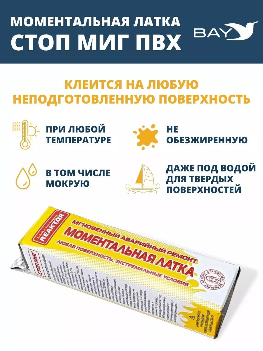 Моментальная латка Reaktor Стоп Миг ПВХ 750 г/м² 50 см² мгновенный, аварийный ремонт в экстремальных условиях. Устранение за секунды любых порезов, проколов: металлические и пластиковые катера, надувные лодки, бассейны, тенты. Клеится на любую неподготовленную поверхность, при любой температуре, в том числе мокрую, не обезжиренную и даже под водой для твердых поверхностей. Мягкие поверхности следует просушить. Латка REAKTOR Стоп Миг изготовлена из прочной ПВХ с мощным клеевым напылением и обеспечивает надежную адгезию.Однако разный коэффициент расширения с изделием и периодическое воздействие различных температур может отрывать от основной поверхности. Поэтому при первой же возможности , проведите полноценный ремонт изделия: нанесите по периметру моментальной латки специальные составы REAKTOR Гель ПВХ, Жидкий ПВХ, или Клей жидкая латка.