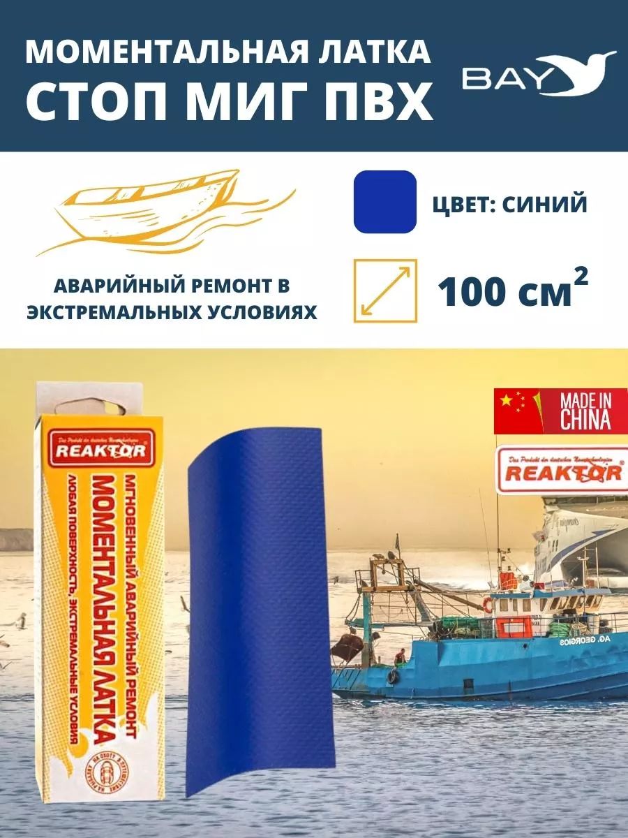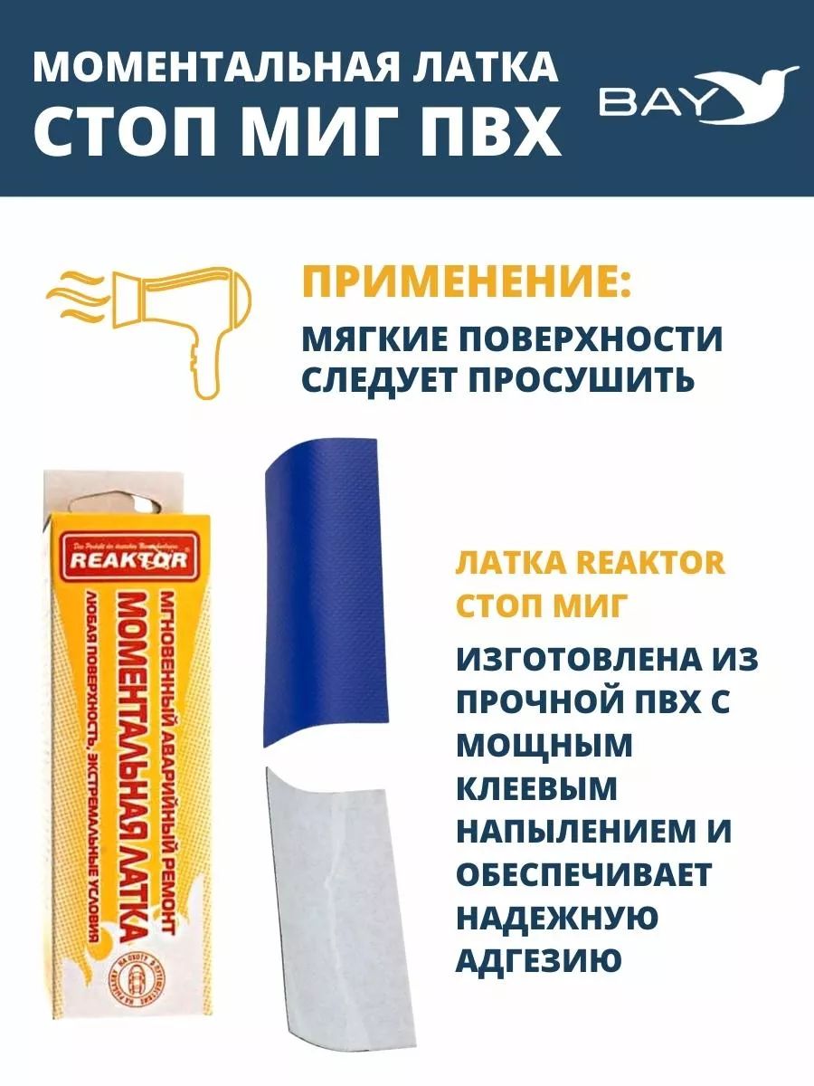 Моментальная латка Reaktor Стоп Миг ПВХ 750 г/м² 50 см² мгновенный, аварийный ремонт в экстремальных условиях. Устранение за секунды любых порезов, проколов: металлические и пластиковые катера, надувные лодки, бассейны, тенты. Клеится на любую неподготовленную поверхность, при любой температуре, в том числе мокрую, не обезжиренную и даже под водой для твердых поверхностей. Мягкие поверхности следует просушить. Латка REAKTOR Стоп Миг изготовлена из прочной ПВХ с мощным клеевым напылением и обеспечивает надежную адгезию.Однако разный коэффициент расширения с изделием и периодическое воздействие различных температур может отрывать от основной поверхности. Поэтому при первой же возможности , проведите полноценный ремонт изделия: нанесите по периметру моментальной латки специальные составы REAKTOR Гель ПВХ, Жидкий ПВХ, или Клей жидкая латка.