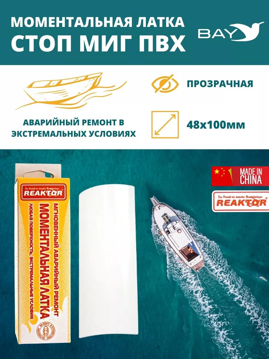 Моментальная латка Reaktor Стоп Миг ПВХ 750 г/м² 50 см² мгновенный, аварийный ремонт в экстремальных условиях. Устранение за секунды любых порезов, проколов: металлические и пластиковые катера, надувные лодки, бассейны, тенты. Клеится на любую неподготовленную поверхность, при любой температуре, в том числе мокрую, не обезжиренную и даже под водой для твердых поверхностей. Мягкие поверхности следует просушить. Латка REAKTOR Стоп Миг изготовлена из прочной ПВХ с мощным клеевым напылением и обеспечивает надежную адгезию.Однако разный коэффициент расширения с изделием и периодическое воздействие различных температур может отрывать от основной поверхности. Поэтому при первой же возможности , проведите полноценный ремонт изделия: нанесите по периметру моментальной латки специальные составы REAKTOR Гель ПВХ, Жидкий ПВХ, или Клей жидкая латка.