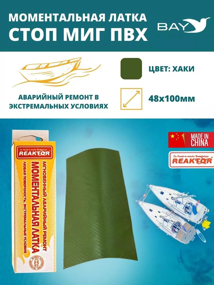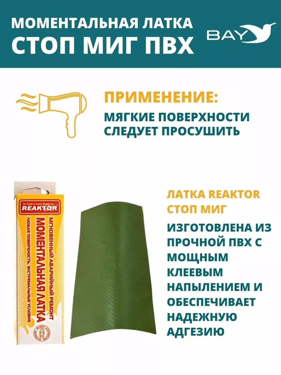 Моментальная латка Reaktor Стоп Миг ПВХ 750 г/м² 50 см² мгновенный, аварийный ремонт в экстремальных условиях. Устранение за секунды любых порезов, проколов: металлические и пластиковые катера, надувные лодки, бассейны, тенты. Клеится на любую неподготовленную поверхность, при любой температуре, в том числе мокрую, не обезжиренную и даже под водой для твердых поверхностей. Мягкие поверхности следует просушить. Латка REAKTOR Стоп Миг изготовлена из прочной ПВХ с мощным клеевым напылением и обеспечивает надежную адгезию.Однако разный коэффициент расширения с изделием и периодическое воздействие различных температур может отрывать от основной поверхности. Поэтому при первой же возможности , проведите полноценный ремонт изделия: нанесите по периметру моментальной латки специальные составы REAKTOR Гель ПВХ, Жидкий ПВХ, или Клей жидкая латка.