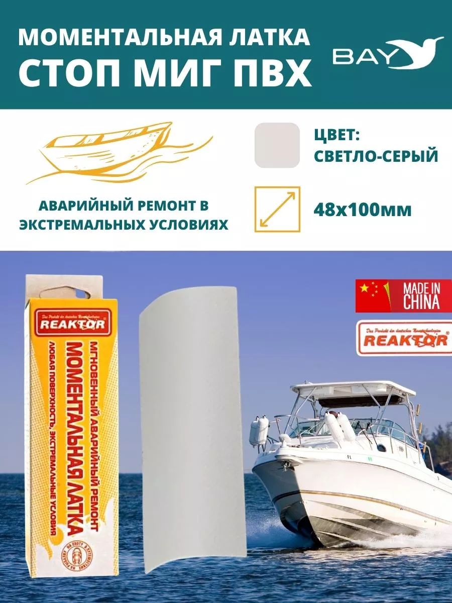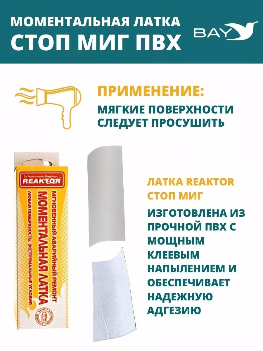 Моментальная латка Reaktor Стоп Миг ПВХ 750 г/м² 50 см² мгновенный, аварийный ремонт в экстремальных условиях. Устранение за секунды любых порезов, проколов: металлические и пластиковые катера, надувные лодки, бассейны, тенты. Клеится на любую неподготовленную поверхность, при любой температуре, в том числе мокрую, не обезжиренную и даже под водой для твердых поверхностей. Мягкие поверхности следует просушить. Латка REAKTOR Стоп Миг изготовлена из прочной ПВХ с мощным клеевым напылением и обеспечивает надежную адгезию.Однако разный коэффициент расширения с изделием и периодическое воздействие различных температур может отрывать от основной поверхности. Поэтому при первой же возможности , проведите полноценный ремонт изделия: нанесите по периметру моментальной латки специальные составы REAKTOR Гель ПВХ, Жидкий ПВХ, или Клей жидкая латка.