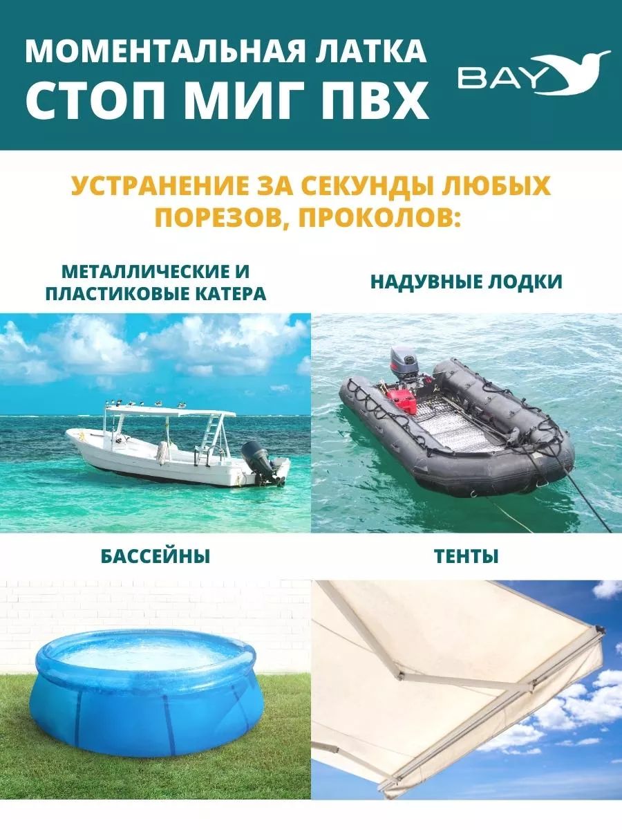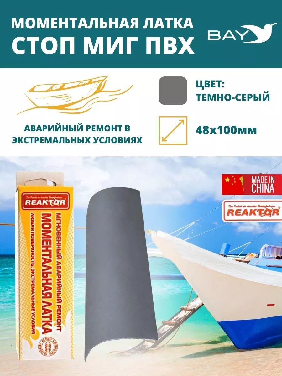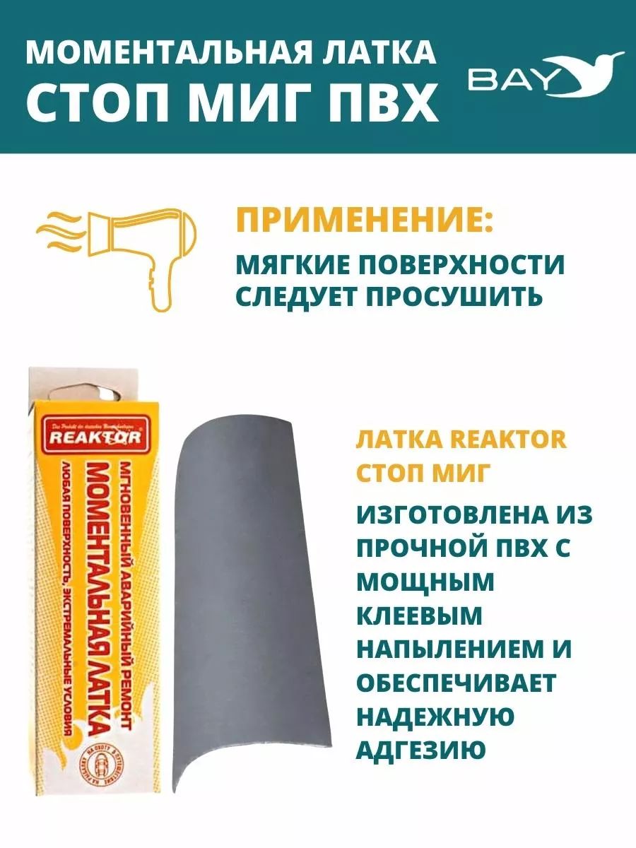 Моментальная латка Reaktor Стоп Миг ПВХ 750 г/м² 50 см² мгновенный, аварийный ремонт в экстремальных условиях. Устранение за секунды любых порезов, проколов: металлические и пластиковые катера, надувные лодки, бассейны, тенты. Клеится на любую неподготовленную поверхность, при любой температуре, в том числе мокрую, не обезжиренную и даже под водой для твердых поверхностей. Мягкие поверхности следует просушить. Латка REAKTOR Стоп Миг изготовлена из прочной ПВХ с мощным клеевым напылением и обеспечивает надежную адгезию.Однако разный коэффициент расширения с изделием и периодическое воздействие различных температур может отрывать от основной поверхности. Поэтому при первой же возможности , проведите полноценный ремонт изделия: нанесите по периметру моментальной латки специальные составы REAKTOR Гель ПВХ, Жидкий ПВХ, или Клей жидкая латка.