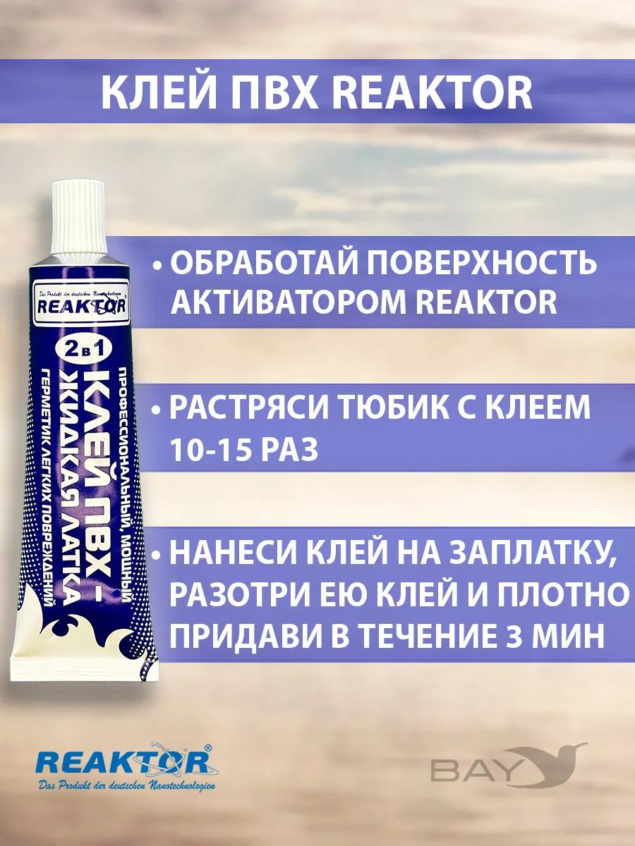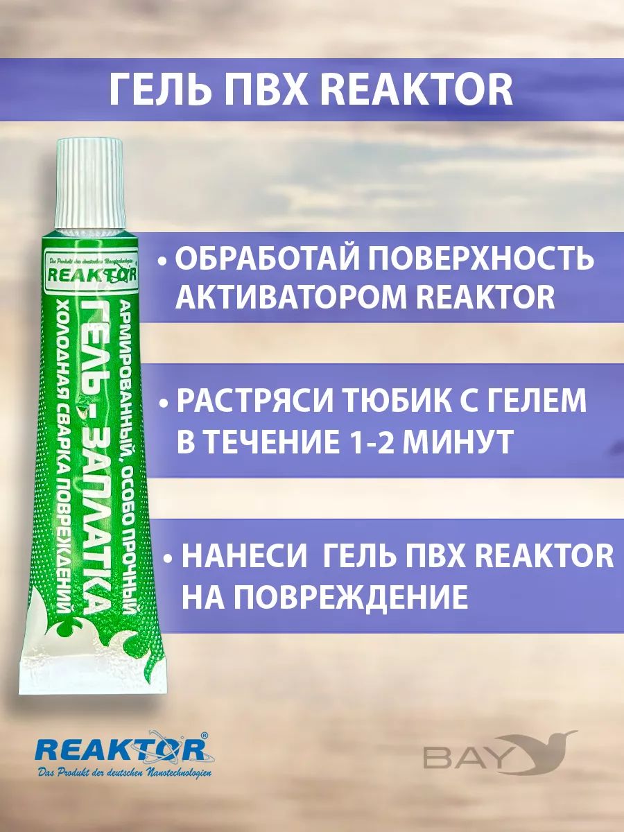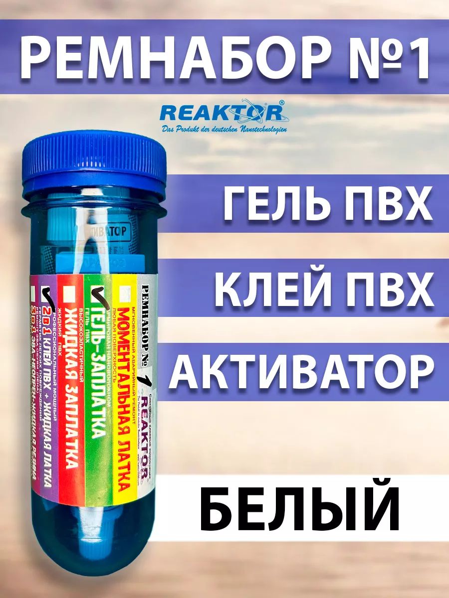 Ремнабор №1 (гель ПВХ, клей ПВХ, активатор, пенал), зеленый, Реактор. СОСТАВ РЕМНАБОРА: Гель ПВХ, шт. - 1. Клей ПВХ, шт. - 1. Активатор, шт. - 1. Пенал (тубус), шт. - 1. ГЕЛЬ ПВХ. Гель ПВХ (гелевая заплатка) – новейший продукт немецких нанотехнологий от компании Reaktor, позволяющий самостоятельно, без латки устранить порезы, проколы, потертости и т.п. повреждения надувных лодок, бассейнов, тентов, вейдерсов, сапог, гидрокостюмов и других изделий из ПВХ тканей, неопрена и прочих полимеров. Холодная сварка поврежденной структуры изделий из мягких полимеров: ПВХ, неопрен, мембрана, полиуретан, искусственные ткани, искусственная кожа и т.п., (за исключением ЭВА, полиэтилен, тефлон). Область применения: надувные лодки и катера, бассейны, тенты, полимерные кровли, наливные полы и полы с мягким покрытием, рыбацкая, спортивная и специальная обувь и т.п. Гель восстанавливает без дополнительных манипуляций ЛЮБЫЕ повреждения, Это могут быть очень крупные порезы, порывы, проколы, пробоины, потертости, и т.д. Клей ПВХ (быстрая заплатка – герметизатор швов) – специально разработанный продукт для оперативного ремонта надувных лодок, бассейнов, тентов и др. изделий из тканей ПВХ. Активатор Reaktor (повышает степень адгезии, ускоряет процесс полимеризации) – специально разработанный реагент от компании Reaktor для первичной обработки повреждений и других склеиваемых поверхностей. Новая агрессивная формула представляет собой композиционный состав активных веществ, синтезированных на основе растворителей, ускорителей и стабилизаторов, применяемых в составе всех продуктов компании, поэтому он универсален. Вся продукция компании Reaktor упакована в дорогие алюминиевые тубы, что предотвращает преждевременную полимеризацию и высыхание. по мере использования подворачивайте «хвостик» тюбика, удаляя лишнее воздушное пространство.