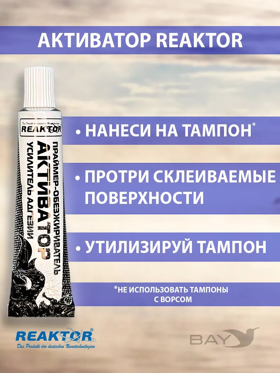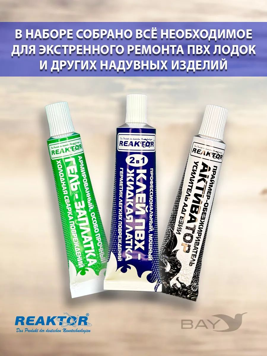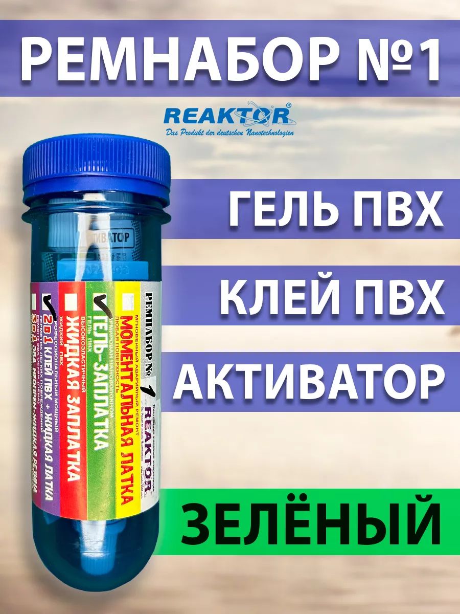 Ремнабор №1 (гель ПВХ, клей ПВХ, активатор, пенал). Реактор. СОСТАВ РЕМНАБОРА: Гель ПВХ, шт. - 1. Клей ПВХ, шт. - 1. Активатор, шт. - 1. Пенал (тубус), шт. - 1. ГЕЛЬ ПВХ. Гель ПВХ (гелевая заплатка) – новейший продукт немецких нанотехнологий от компании Reaktor, позволяющий самостоятельно, без латки устранить порезы, проколы, потертости и т.п. повреждения надувных лодок, бассейнов, тентов, вейдерсов, сапог, гидрокостюмов и других изделий из ПВХ тканей, неопрена и прочих полимеров. Холодная сварка поврежденной структуры изделий из мягких полимеров: ПВХ, неопрен, мембрана, полиуретан, искусственные ткани, искусственная кожа и т.п., (за исключением ЭВА, полиэтилен, тефлон). Область применения: надувные лодки и катера, бассейны, тенты, полимерные кровли, наливные полы и полы с мягким покрытием, рыбацкая, спортивная и специальная обувь и т.п. Гель восстанавливает без дополнительных манипуляций ЛЮБЫЕ повреждения, Это могут быть очень крупные порезы, порывы, проколы, пробоины, потертости, и т.д. Клей ПВХ (быстрая заплатка – герметизатор швов) – специально разработанный продукт для оперативного ремонта надувных лодок, бассейнов, тентов и др. изделий из тканей ПВХ. Активатор Reaktor (повышает степень адгезии, ускоряет процесс полимеризации) – специально разработанный реагент от компании Reaktor для первичной обработки повреждений и других склеиваемых поверхностей. Новая агрессивная формула представляет собой композиционный состав активных веществ, синтезированных на основе растворителей, ускорителей и стабилизаторов, применяемых в составе всех продуктов компании, поэтому он универсален. Вся продукция компании Reaktor упакована в дорогие алюминиевые тубы, что предотвращает преждевременную полимеризацию и высыхание. по мере использования подворачивайте «хвостик» тюбика, удаляя лишнее воздушное пространство.