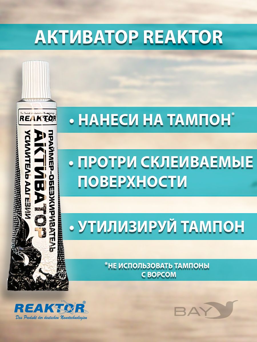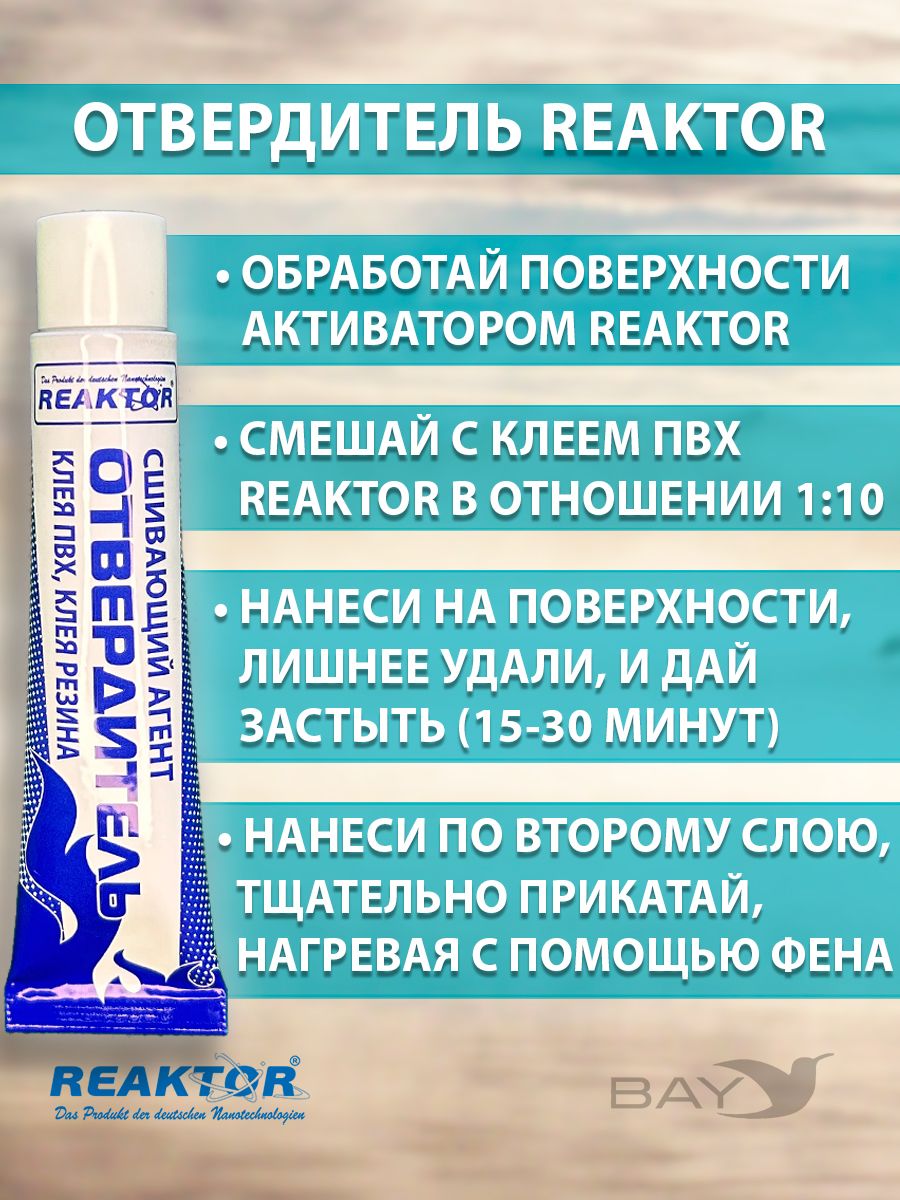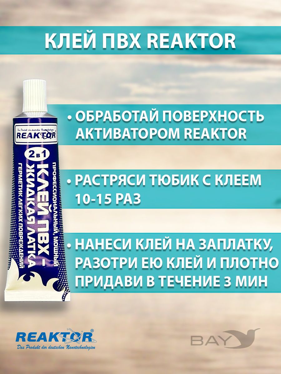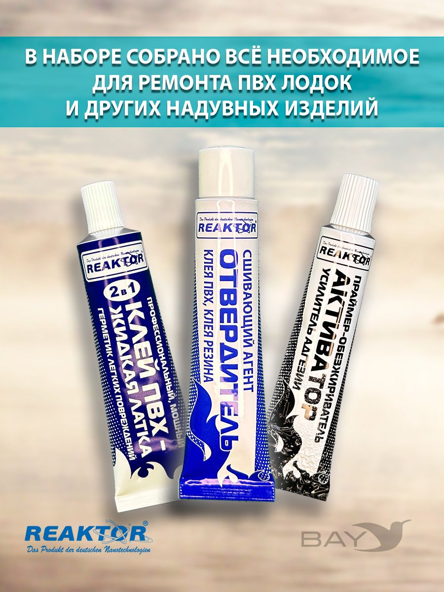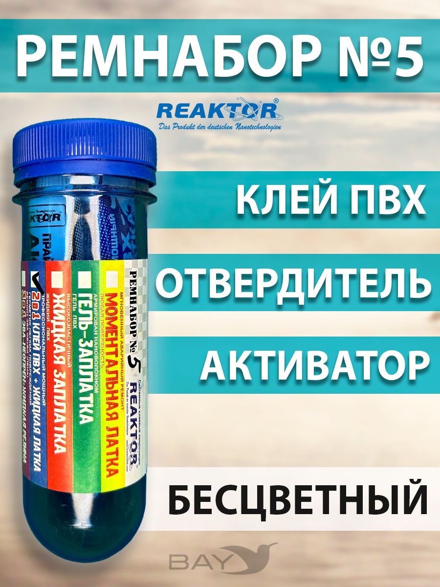 Ремнабор №5. СОСТАВ: Клей ПВХ,2в1-1; Отвердитель- 1; Активатор-1; Пенал (тубус)-1; Клей ПВХ (быстрая заплатка – герметизатор швов) – специально разработанный продукт от компании Reaktor для оперативного ремонта надувных лодок, бассейнов, тентов и др. изделий из тканей ПВХ. Клей ПВХ предназначен для оперативного ремонта! Отвердитель (второй компонент для клеевых составов) Сшивающий агент. Высокотехнологичный продукт, в смеси с «КЛЕЕМ ПВХ», или «КЛЕЕМ РЕЗИНА» позволяет надежно и быстро склеить изделия из ПВХ, или резинотехнические изделия. Двухкомпонентный клеевой состав не разрушается под воздействием высоких температур и при значительных нагрузках. Применяется для ремонта и изготовления изделий из ПВХ, или резины, где требуется склеивание: лодки, обувь, бассейны, тенты и т.п. Активатор (повышает степень адгезии, ускоряет процесс полимеризации) – специально разработанный реагент от компании Reaktor для первичной обработки повреждений и других склеиваемых поверхностей. Новая агрессивная формула представляет собой композиционный состав активных веществ, синтезированных на основе растворителей, ускорителей и стабилизаторов, применяемых в составе всех продуктов компании, поэтому он универсален. ИНСТРУКЦИЯ -Обработайте обе склеиваемые поверхности «АКТИВАТОРОМ». При незначительных повреждениях допускается использование других обезжиривателей, но 100% эффект при этом не гарантируется. Тщательно смешайте 1 часть «ОТВЕРДИТЕЛЯ» с 10 частями «КЛЕЯ ПВХ», или «КЛЕЯ РЕЗИНА». Нанесите на обе поверхности тонким слоем, лишнее количество смеси удалите. Дайте застыть в течение 15-30 минут, затем нанесите по второму слою описанным выше способом и тщательно прикатайте обе поверхности, нагревая с помощью фена. Срок полной полимеризации: 12 – 24 часа. Двухкомпонентный клеевой состав Отвердитель + Клей ПВХ необходимо выработать в течение 6 часов. Состав: модифицированные полизоционаты, активаторы, ускорители, стабилизаторы.