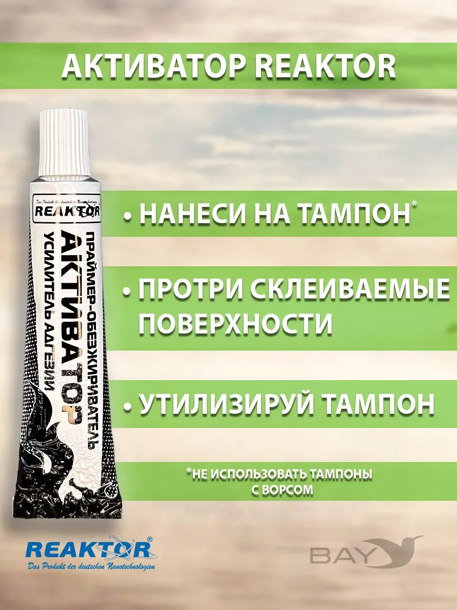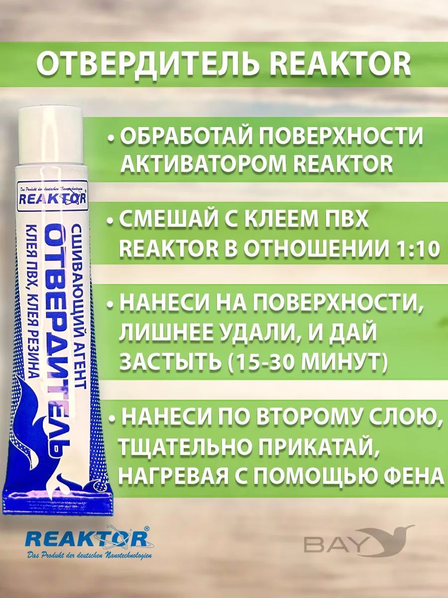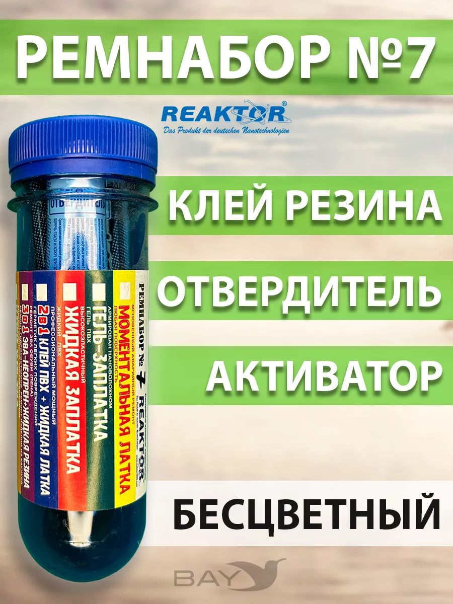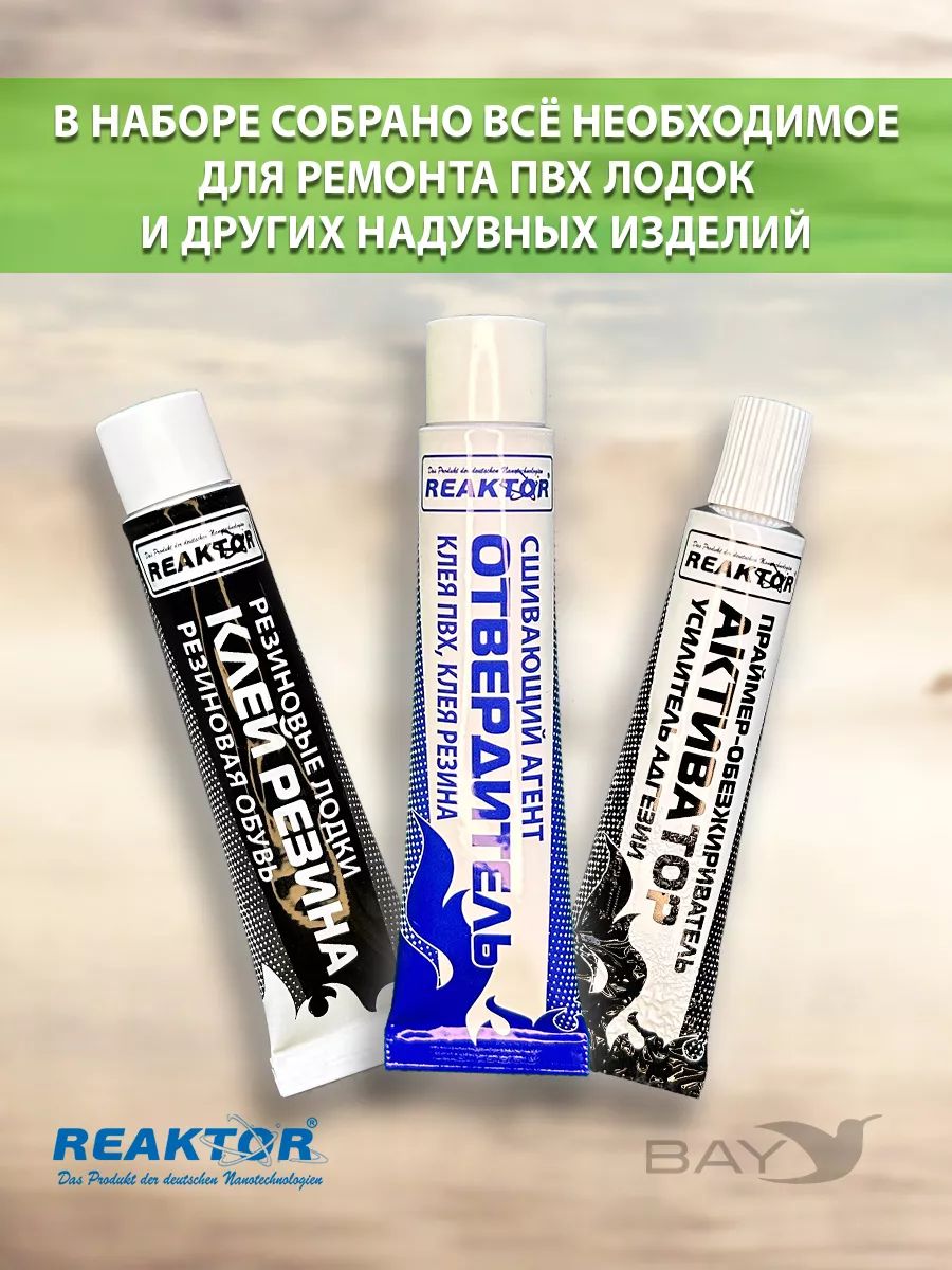 Ремнабор №7 (клей резина + отвердитель + активатор + пенал). Клей резина. Надежная адгезия, в том числе в двухкомпонентном составе с отвердителем к изделиям, имеющим в своем составе натуральный и искусственный каучук: резиновые лодки, резиновая обувь и т. п. отвердитель. Второй компонент - сшивающий агент для клеевых составов. Рекомендуется применять с клеем ПВХ и клеем резина во всех случаях, когда требуется ответственное, высокопрочное клеевое соединение. Активатор. Обезжириватель, праймер. Повышает адгезию, ускоряет процесс полимеризации. Испаряясь, активные вещества, входящие в состав активатора, втягивают продукты реактор глубоко внутрь тканей. Рекомендуется применять со всеми продуктами реактор и во всех случаях первичной обработки, и обезжиривания. Использование других обезжиривателей допустимо, но 100% эффект не гарантирован.