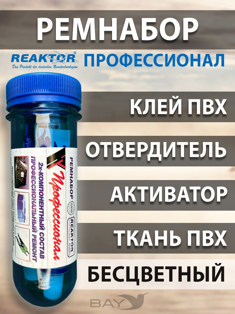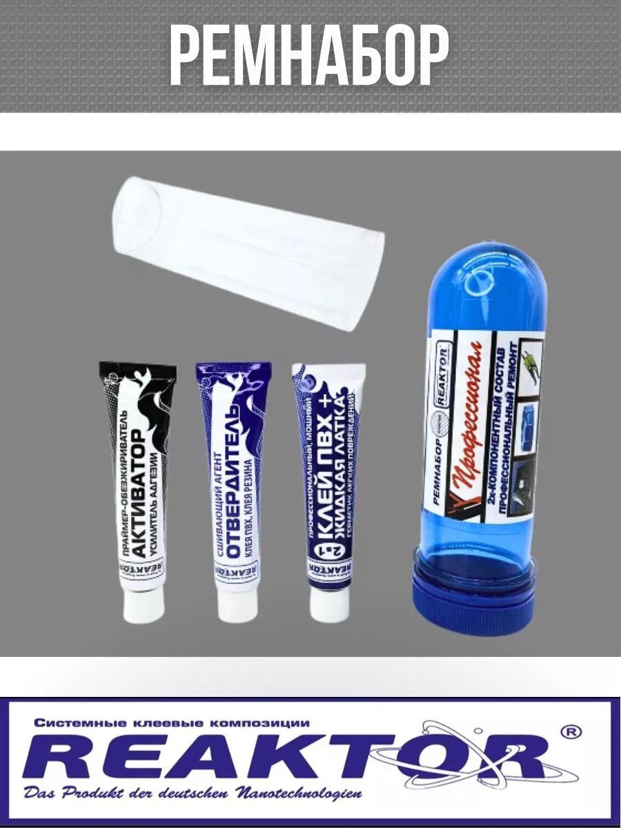 Ремнабор "Профессионал" (КЛЕЙ ПВХ + ОТВЕРДИТЕЛЬ + АКТИВАТОР +ТКАНЬ ПВХ+ПЕНАЛ) Бесцветный. Ремнабор "Профессионал" (клей ПВХ, отвердитель, активатор, ткань ПВХ, пенал), бесцветный, Реактор. Подходит для ремонта бассейнов. Цвет: бесцветный. СОСТАВ РЕМНАБОРАКлей ПВХ, 2 в 1, шт. - 1. Отвердитель, шт. - 1. Активатор, шт. - 1. Ткань ПВХ 700 гр/м2 100 см2, шт. - 1. Пенал (тубус), шт. - 1. КЛЕЙ ПВХ - Клей ПВХ (быстрая заплатка – герметизатор швов) – специально разработанный продукт от компании Reaktor для оперативного ремонта надувных лодок, бассейнов, тентов и др. изделий из тканей ПВХ. Клей ПВХ предназначен для оперативного ремонта! До полной полимеризации не накачивайте лодку и другие надувные изделия, используемые на воде, до максимально рекомендованного значения, а накачайте по возможному минимуму лишь для поддержания ее на плаву! Избегайте эксплуатации лодки при температуре свыше 40 градусов цельсия! При ремонте лодок и других надувных изделий, используемых на воде, периодически проверяйте герметичность отремонтированных повреждений!ОТВЕРДИТЕЛЬ - Отвердитель (второй компонент для клеевых составов) Сшивающий агент. Высокотехнологичный продукт, в смеси с «КЛЕЕМ ПВХ», или «КЛЕЕМ РЕЗИНА» позволяет надежно и быстро склеить изделия из ПВХ, или резинотехнические изделия. Двухкомпонентный клеевой состав не разрушается под воздействием высоких температур и при значительных нагрузках. Применяется для ремонта и изготовления изделий из ПВХ, или резины, где требуется склеивание: лодки, обувь, бассейны, тенты и т.п. АКТИВАТОР - Активатор Reaktor (повышает степень адгезии, ускоряет процесс полимеризации) – специально разработанный реагент от компании Reaktor для первичной обработки повреждений и других склеиваемых поверхностей. Новая агрессивная формула представляет собой композиционный состав активных веществ, синтезированных на основе растворителей, ускорителей и стабилизаторов, применяемых в составе всех продуктов компании, поэтому он универсален. ИНСТРУКЦИЯ ПО ПРИМЕНЕНИЮ: Обработайте обе склеиваемые поверхности «АКТИВАТОРОМ». При незначительных повреждениях допускается использование других обезжиривателей, но 100% эффект при этом не гарантируется. Тщательно смешайте 1 часть «ОТВЕРДИТЕЛЯ» с 10 частями «КЛЕЯ ПВХ», или «КЛЕЯ РЕЗИНА». Нанесите на обе поверхности тонким слоем, лишнее количество смеси удалите. Дайте застыть в течение 15-30 минут, затем нанесите по второму слою описанным выше способом и тщательно прикатайте обе поверхности, нагревая с помощью фена. Срок полной полимеризации: 12 – 24 часа. Двухкомпонентный клеевой состав Отвердитель + Клей ПВХ необходимо выработать в течение 6 часов. Состав: модифицированные полизоционаты, активаторы, ускорители, стабилизаторы.