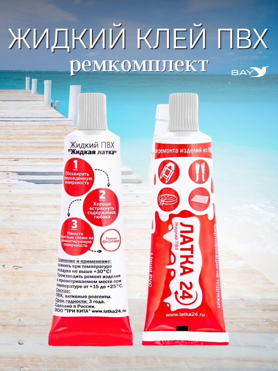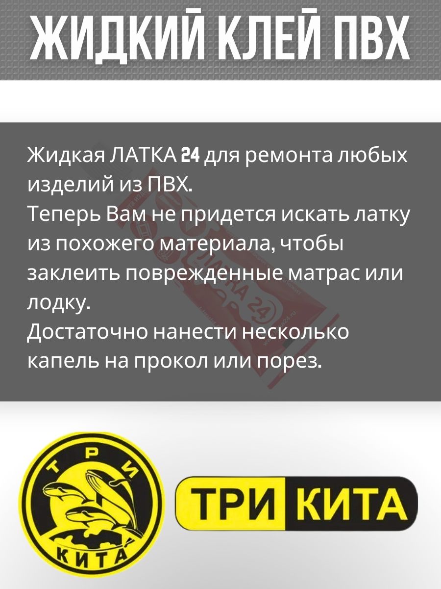 Латка 24 может приходить с разным дизайном упаковки, не ухудшающим качество товара, что является правом производителя. Жидкая ЛАТКА 24 для ремонта любых изделий из ПВХ. Теперь Вам не придется искать латку из похожего материала, чтобы заклеить поврежденные матрас или лодку. Достаточно нанести несколько капель на прокол или порез. Возьми с собой в горы, на море, на реку, в поход Жидкую ЛАТКУ 24! Ремонтируемая поверхность должна быть сухой и чистой. При проколе изделия или порезе до 3 см просто нанесите одну или несколько капель состава Жидкой Латки 24 на место прокола или пореза. Для достижения наилучшего результата повторно нанести слой состава через несколько минут. Если повреждение значительно и имеет форму разрыва или пореза более 3 см. - то следует использовать специальную кордовую ткань.