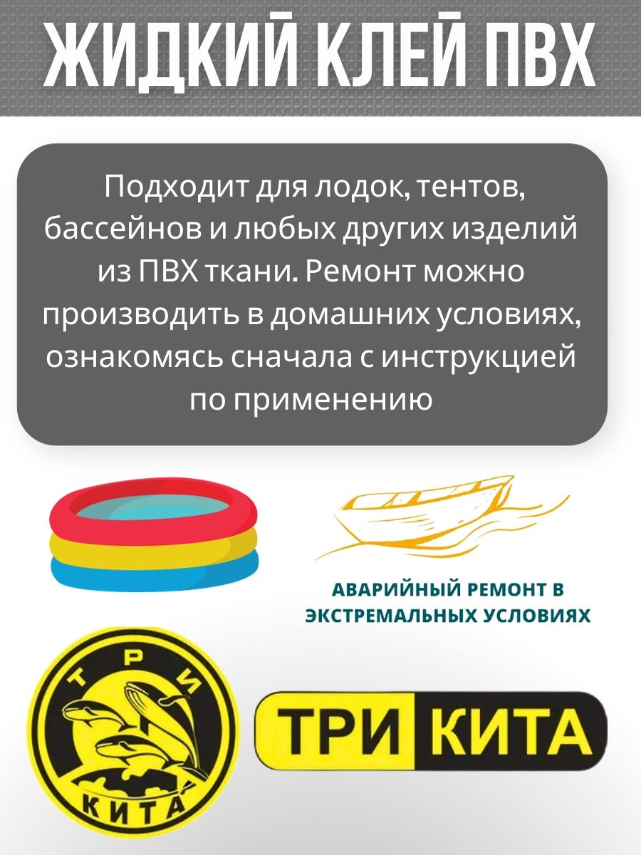Непогода на рыбалке, и ваша резиновая лодка показала свою уникальность. Такое случается, но вы не переживайте! Ведь теперь у вас есть надежная жидкая латка, которую можно использовать для ремонта вашей ПВХ-лодки. Этот водостойкий клей прекрасно справится с задачей.Когда на поверхности лодочки появится маленькое повреждение, будь то царапина или потертость, этот клей для резины поможет вам вернуть ей прочность и сохранить ее работоспособность. Сразу после применения жидкой латки веселые рыболовные приключения на вашей лодке продолжатся!Не только для ремонта лодок, но и для других видов активного отдыха этот клей является незаменимым товаром. Он подходит также для эва-лодочек и других изделий из ПВХ. Берегите свои ценные вещи и аксессуары - с помощью этого клея они всегда будут в безупречном состоянии.Наши товары созданы специально для любителей рыбалки и туризма.