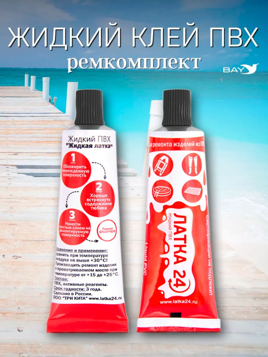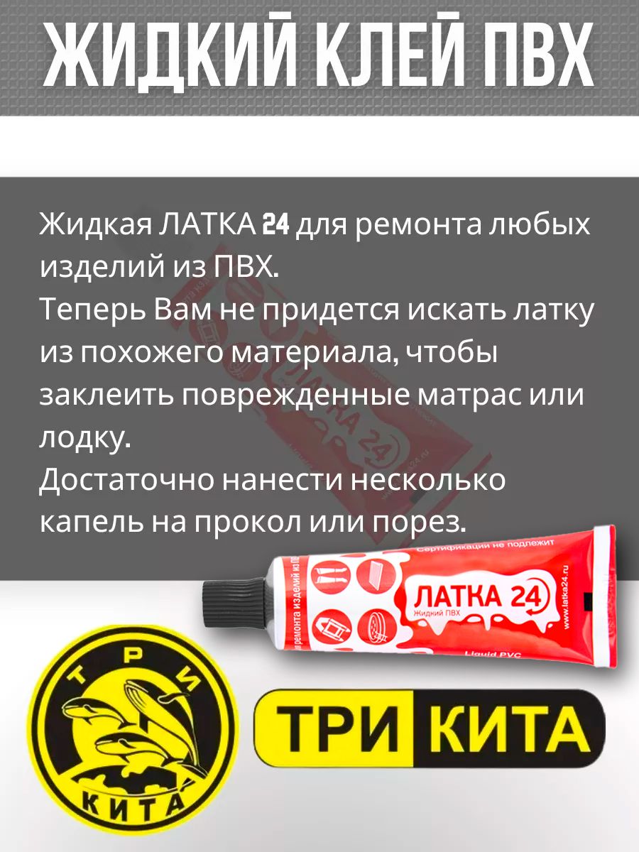 Латка 24 может приходить с разным дизайном упаковки, не ухудшающим качество товара, что является правом производителя. Жидкая ЛАТКА 24 для ремонта любых изделий из ПВХ. Теперь Вам не придется искать латку из похожего материала, чтобы заклеить поврежденные матрас или лодку. Достаточно нанести несколько капель на прокол или порез. Возьми с собой в горы, на море, на реку, в поход Жидкую ЛАТКУ 24! Ремонтируемая поверхность должна быть сухой и чистой. При проколе изделия или порезе до 3 см просто нанесите одну или несколько капель состава Жидкой Латки 24 на место прокола или пореза. Для достижения наилучшего результата повторно нанести слой состава через несколько минут. Если повреждение значительно и имеет форму разрыва или пореза более 3 см. - то следует использовать специальную кордовую ткань.