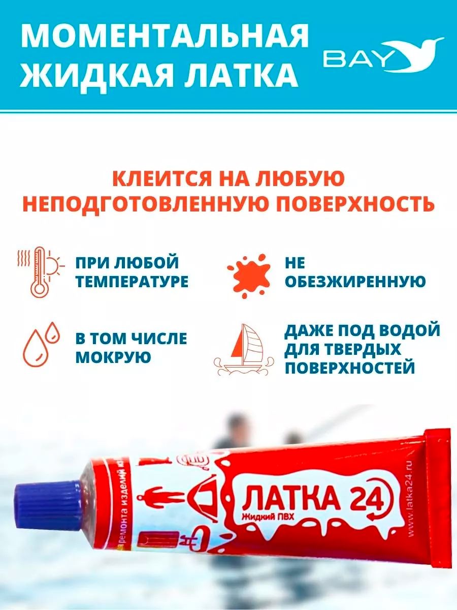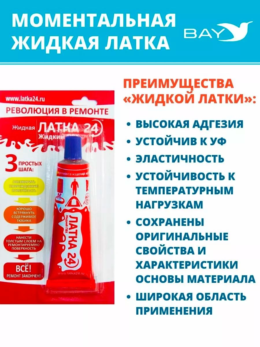 Латка 24 может приходить с разным дизайном упаковки, не ухудшающим качество товара, что является правом производителя. Жидкая ЛАТКА 24 для ремонта любых изделий из ПВХ. Теперь Вам не придется искать латку из похожего материала, чтобы заклеить поврежденные матрас или лодку. Достаточно нанести несколько капель на прокол или порез. Возьми с собой в горы, на море, на реку, в поход Жидкую ЛАТКУ 24! Ремонтируемая поверхность должна быть сухой и чистой. При проколе изделия или порезе до 3 см просто нанесите одну или несколько капель состава Жидкой Латки 24 на место прокола или пореза. Для достижения наилучшего результата повторно нанести слой состава через несколько минут. Если повреждение значительно и имеет форму разрыва или пореза более 3 см. - то следует использовать специальную кордовую ткань.