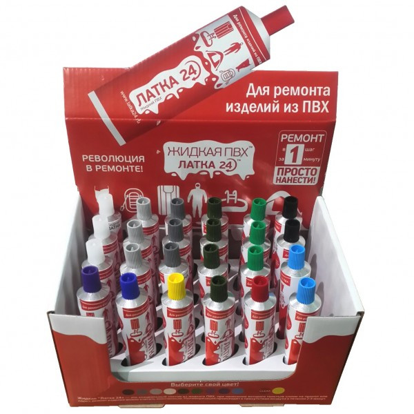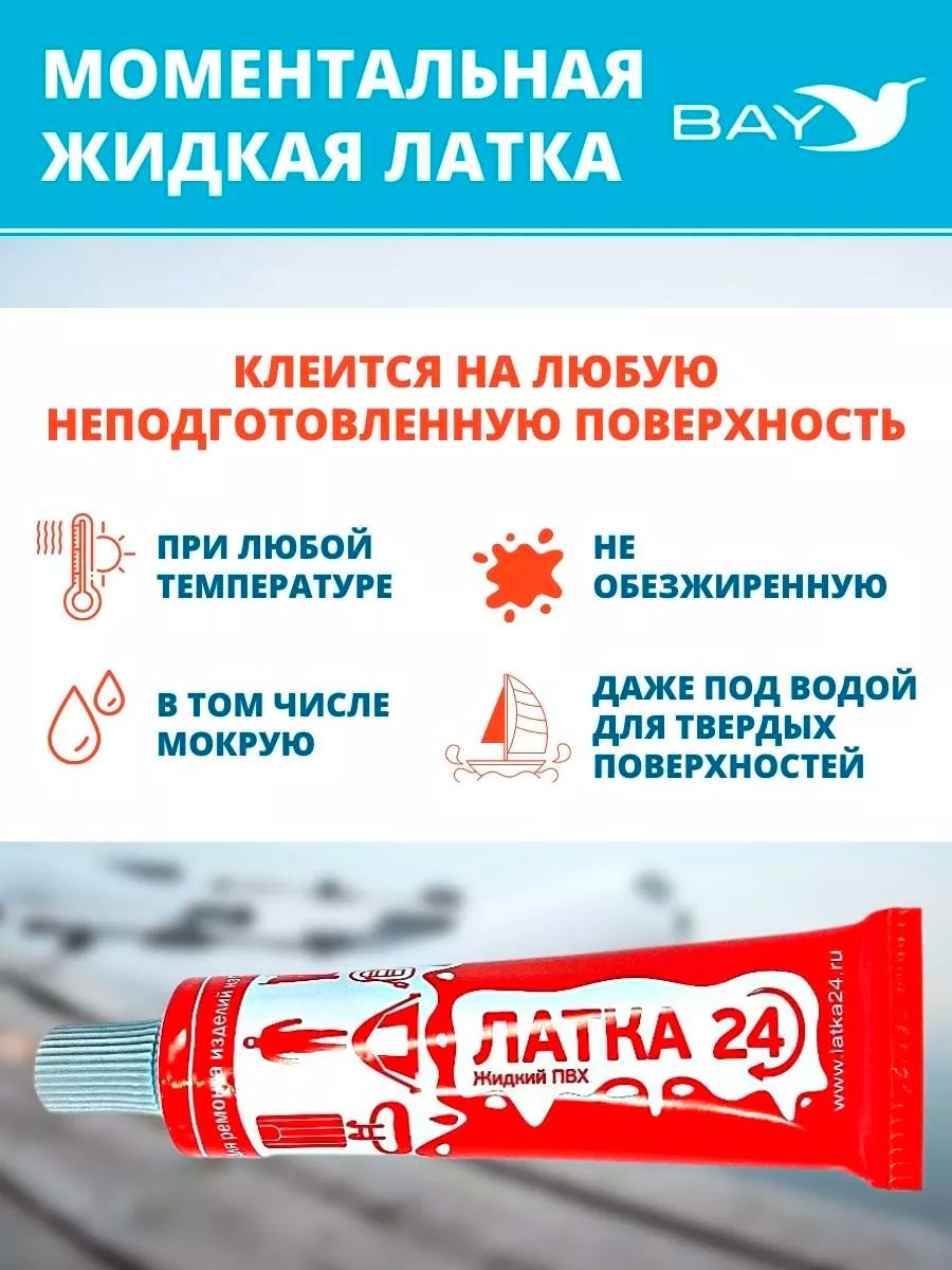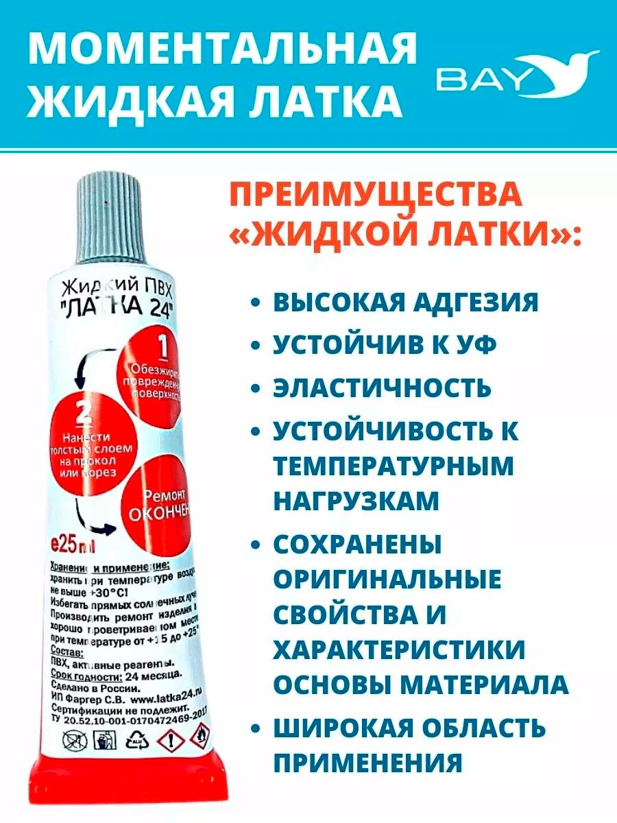 Латка 24 может приходить с разным дизайном упаковки, не ухудшающим качество товара, что является правом производителя. Жидкая ЛАТКА 24 для ремонта любых изделий из ПВХ. Теперь Вам не придется искать латку из похожего материала, чтобы заклеить поврежденные матрас или лодку. Достаточно нанести несколько капель на прокол или порез. Возьми с собой в горы, на море, на реку, в поход Жидкую ЛАТКУ 24! Ремонтируемая поверхность должна быть сухой и чистой. При проколе изделия или порезе до 3 см просто нанесите одну или несколько капель состава Жидкой Латки 24 на место прокола или пореза. Для достижения наилучшего результата повторно нанести слой состава через несколько минут. Если повреждение значительно и имеет форму разрыва или пореза более 3 см. - то следует использовать специальную кордовую ткань.