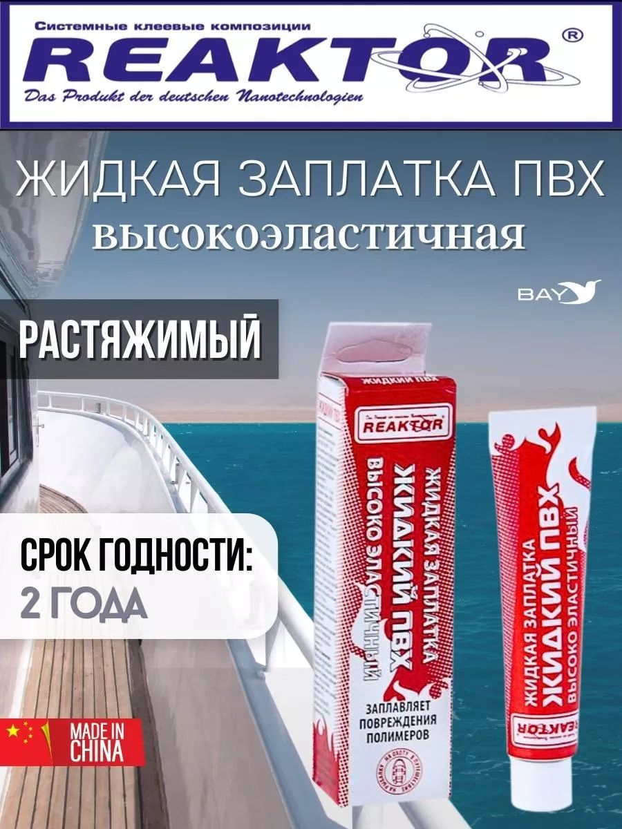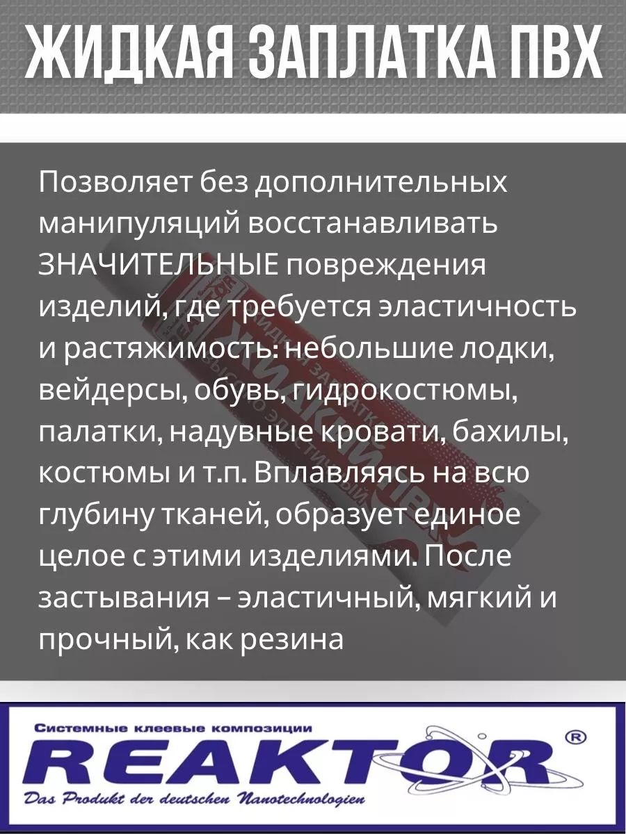 Жидкий ПВХ – продукт немецких нанотехнологий, позволяющий самостоятельно, без латки устранить небольшие порезы, проколы, потертости и т. п. повреждения надувных лодок, бассейнов, тентов, вейдерсов, сапог, гидрокостюмов и других изделий из пвх тканей, неопрена и прочих полимеров. Неармированный Жидкий ПВХ представляет собой композиционный состав суспензии поливинилхлорида, активаторов, ускорителей и стабилизаторов. В процессе полимеризации Жидкий ПВХ, с помощью активных реагентов, воздействует на ткани пвх, растворяет их, проникая в кордовую структуру материала и образует с ним единое целое – поливинилхлоридное покрытие (пленку). Для достижения наилучшего результата: Очистите и обезжирьте поврежденную поверхность Активатором, который гарантированно поможет достичь максимально возможную адгезию жидкого пвх с поливинилхлоридными тканями. В случае отсутствия активатора допустимо использовать любой спирто-, или ацетоно- содержащий растворитель, однако 100% результат в этом случае не гарантирован. 10 – 15 раз встряхните тюбик, чтобы размешать ингредиенты. Нанесите Жидкий ПВХ на повреждение: всё, работы по ремонту закончены! Поскольку жидкая заплатка – это всего лишь поливинилхлоридная пленка, то она предназначена для ремонта небольших повреждений. Если травления значительны, наносите Жидкий ПВХ Reaktor послойно через каждые 15 – 30 минут: чем более серьезны травления, тем большее количество слоев следует нанести. Для небольшого прокола крючком достаточно одной капли «с горкой»; для травления шва на каждые 1 – 2 сантиметра – дополнительный слой. Во избежание протекания, простелите полиэтиленовый пакет под повреждение. Полная полимеризация наступит не ранее чем через 48 часов, однако изделие можно использовать под неполной нагрузкой спустя 3 – 12 часов (зависит от характера повреждения и температуры окружающего воздуха).