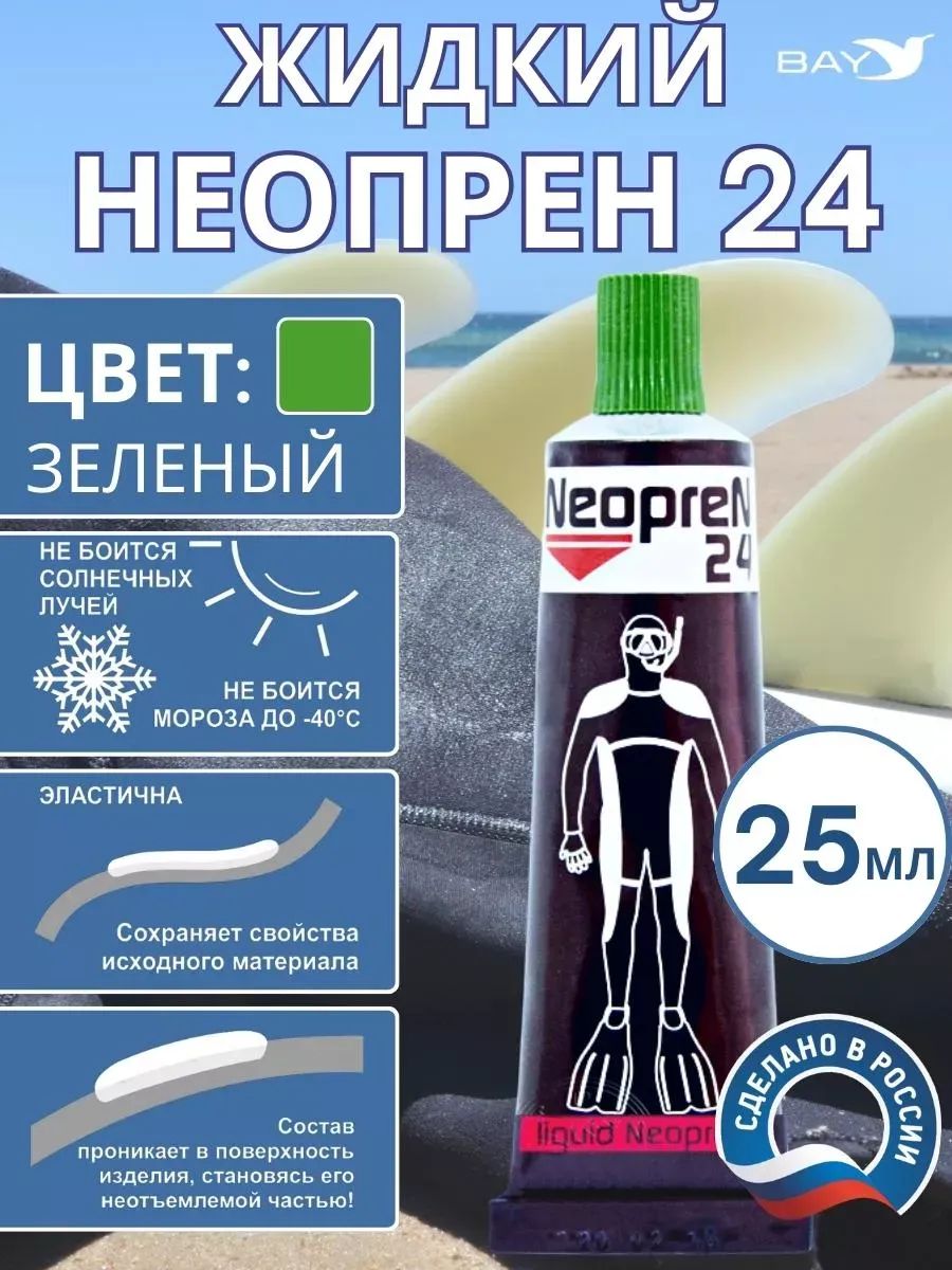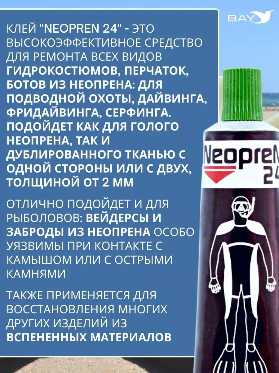Клей "NEOPREN 24" - это высокоэффективное средство для ремонта всех видов гидрокостюмов, перчаток, ботов из неопрена: для подводной охоты, дайвинга, фридайвинга, серфинга. Подойдет как для голого неопрена, так и дублированного тканью с одной стороны или с двух, толщиной от 2 мм. Отлично подойдет и для рыболовов: вейдерсы и заброды из неопрена особо уязвимы при контакте с камышом или с острыми камнями. Также применяется для восстановления многих других изделий из вспененных материалов.Инструкция по применению: Нанести тонкий слой на торцы пореза или разрыва, подсушить на воздухе до липкого состояния 20-30 секунд и сильно прижать на несколько секунд. Ремонт окончен. Через 10-20 минут прочность соединения будет на уровне 40-60%, через сутки - 100%. Допускается наносить средство без подсушки, при этом время фиксации и максимальной прочности будет значительно увеличено. При сложном ремонте больших порезов и разрывов рекомендуется использовать цветное средство Neopren 24, отличного по цвету от ремонтируемого материала. К примеру, на черном неопрене, используя желтый или другой маркерный цвет, вы видите все заполненные клеем участки и контролируете равномерную толщину нанесения. Результат - аккуратный шов, качественный ремонт и полная герметичность. Полное высыхание через 12-24 часа. Характеристики: Объем - 25 мл. Состав - полихлоропрен, жидкий неопрен, активные реагенты, пигменты.