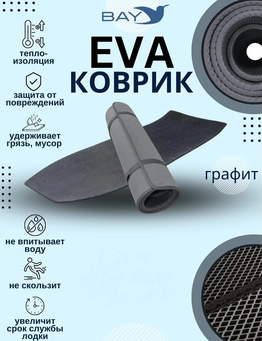 - Позволяет содержать вашу лодку в чистоте и экономит ваше время на мытье пола в лодке. Вся грязь с обуви остается на Eva коврике и вам останется только сполоснуть сам коврик, в то время как пол лодки остается чистым. Коврик Эва легко моется, не впитывает влагу и быстро сохнет.