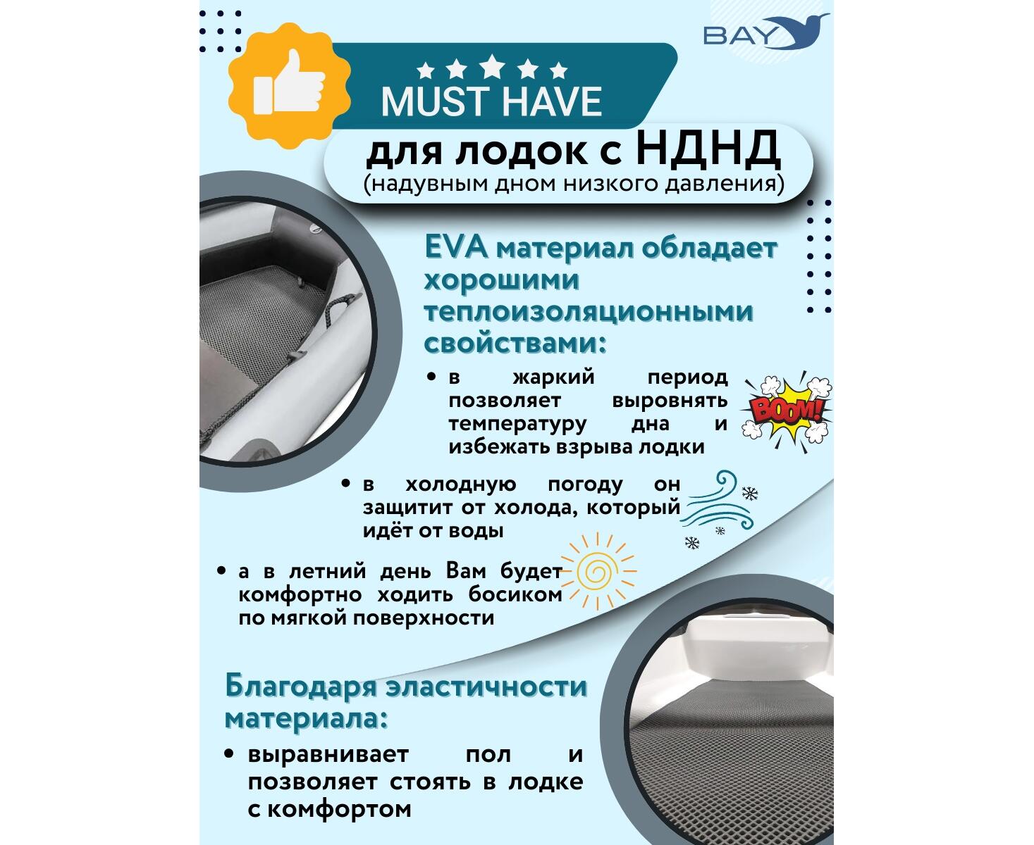 - Выравнивает пол в лодках с НДНД (надувным дном низкого давления) и позволяет с комфортом стоять в лодке.