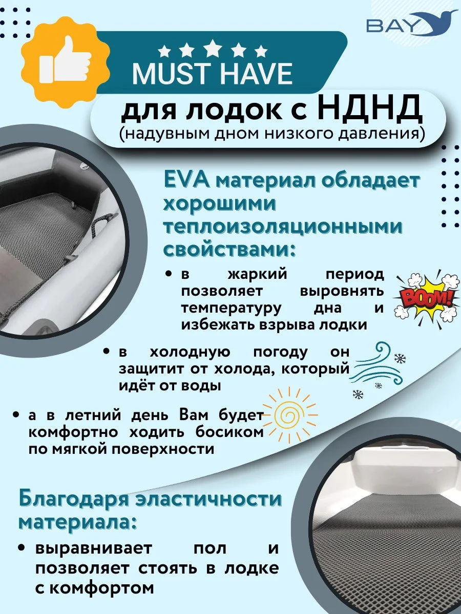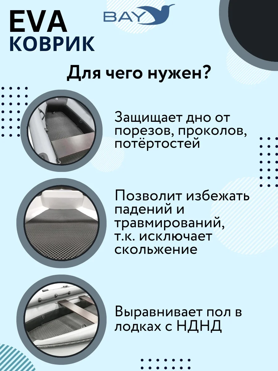 - Позволяет содержать вашу лодку в чистоте и экономит ваше время на мытье пола в лодке. Вся грязь с обуви остается на Eva коврике и вам останется только сполоснуть сам коврик, в то время как пол лодки остается чистым. Коврик Эва легко моется, не впитывает влагу и быстро сохнет.