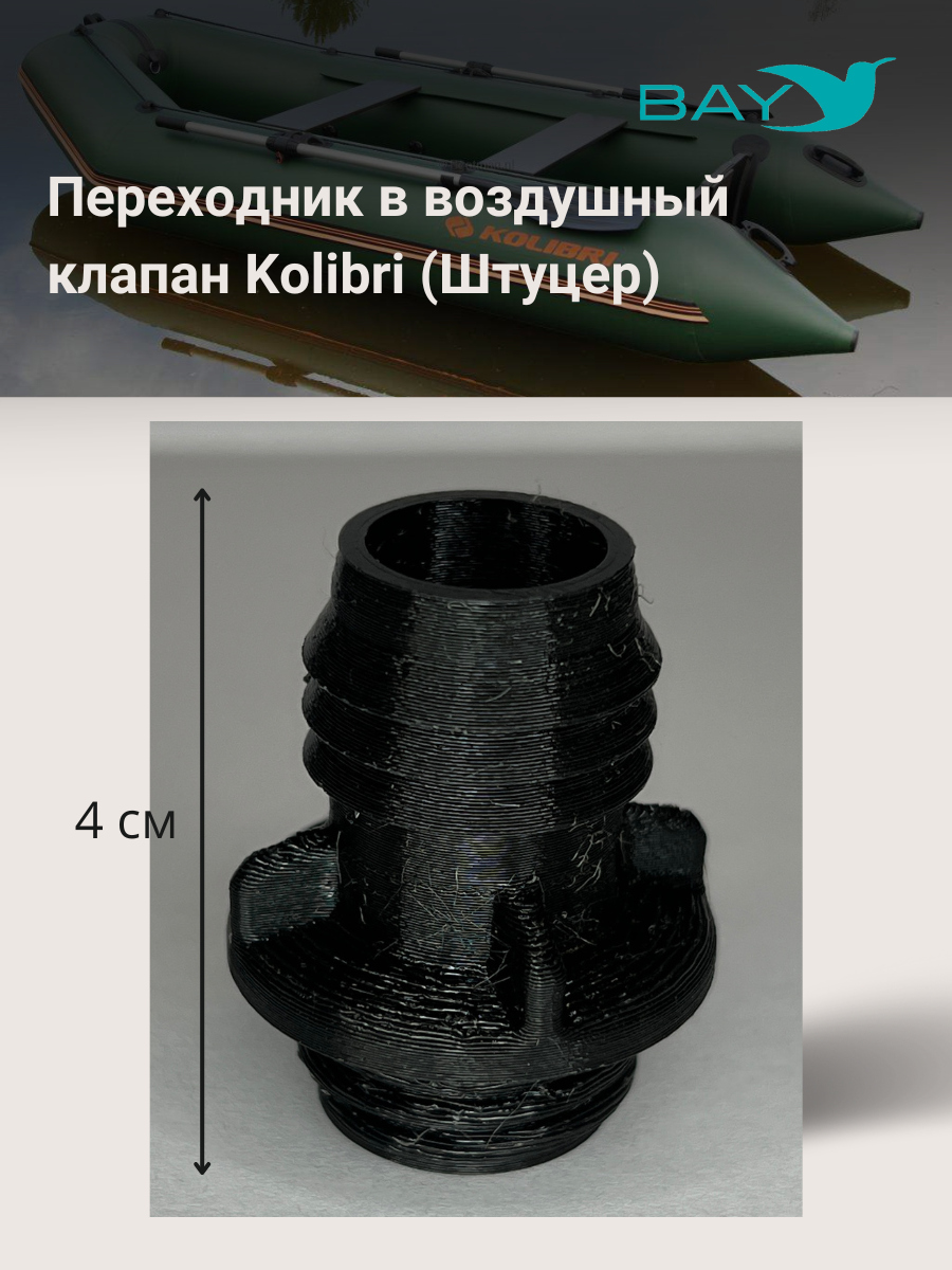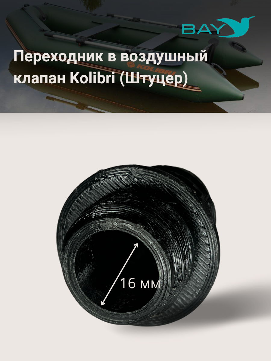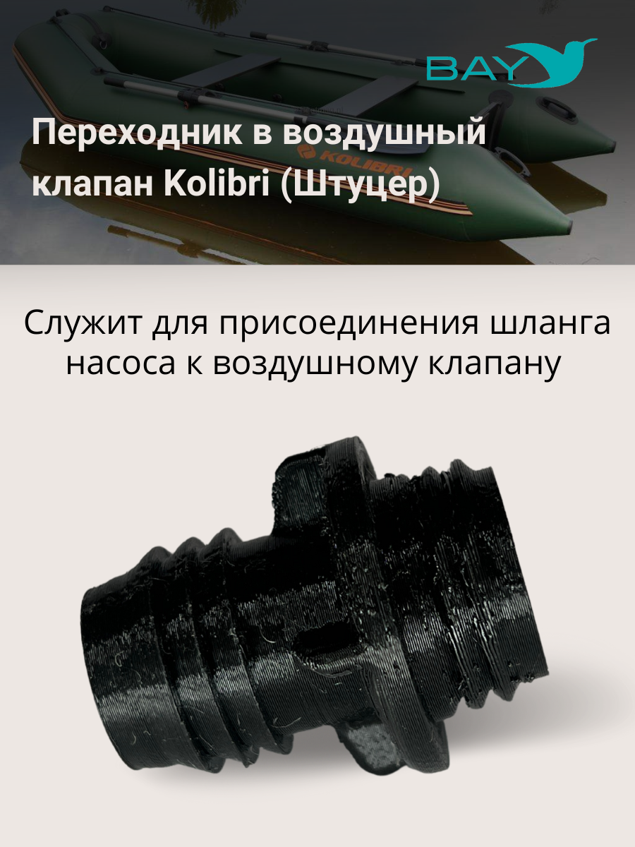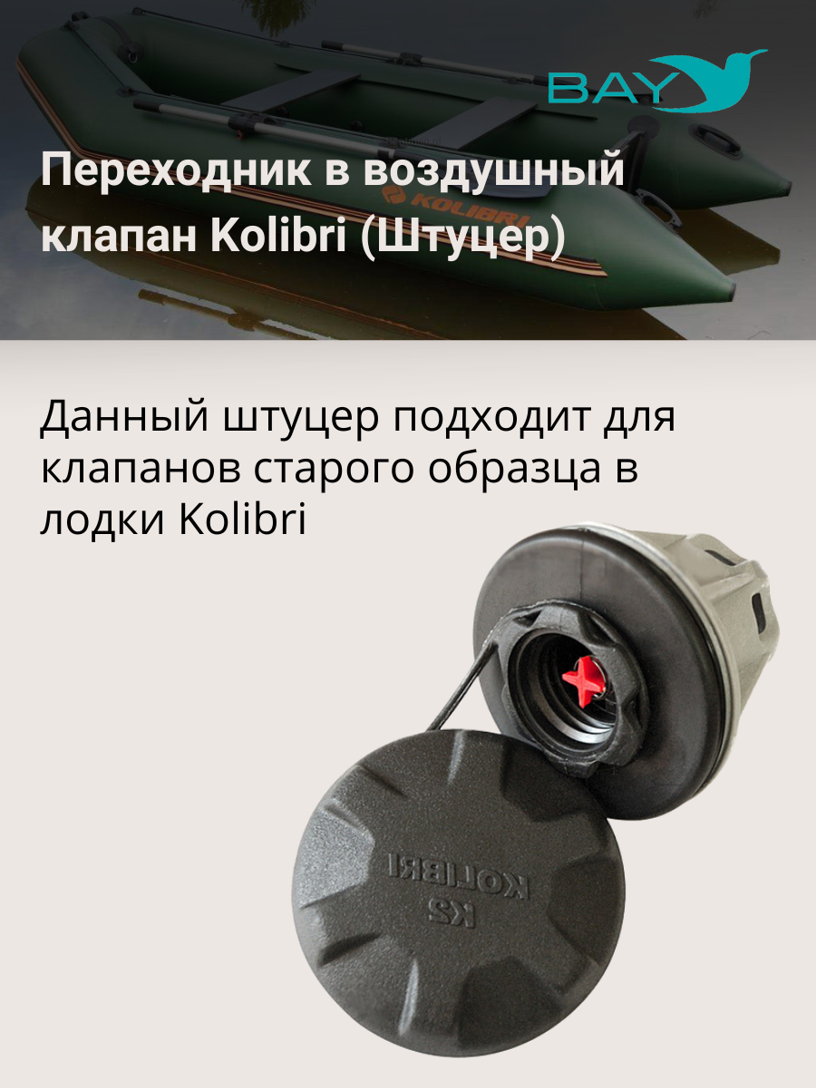 Переходник на воздушный клапан для лодок Kolibri (Колибри) для моделей произведенных до 2019 года. Служит для присоединения шланга насоса к воздушному клапану