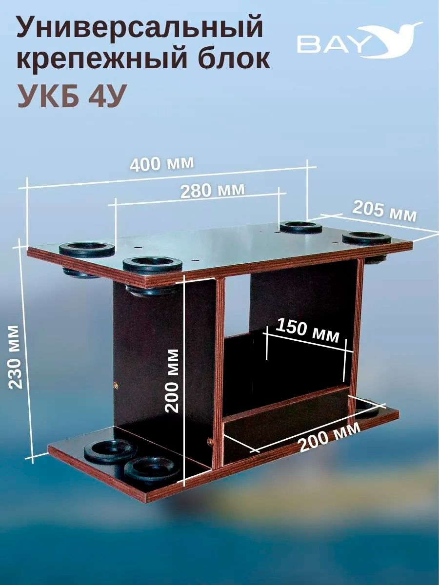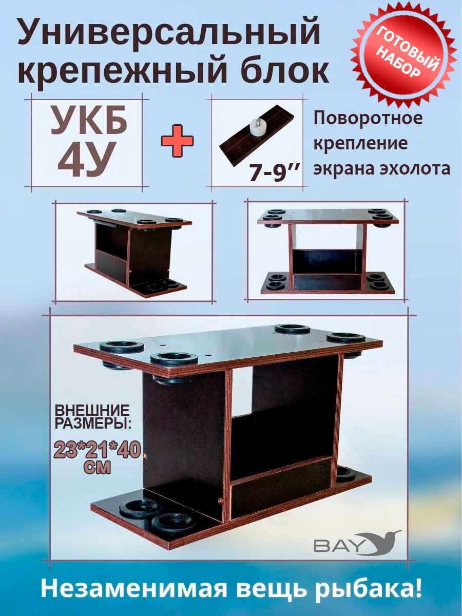 Универсальный крепежный блок с отверстиями под 4 удилища УКБ 4У - это многофункциональная конструкция, выполненная из водостойкой фанеры, которая позволяет удобно зафиксировать эхолот (картплоттер, навигатор), четыре спиннинга или удочки и АКБ. Функциональная и универсальная вещь для Вашего комфорта. Верхняя и нижняя части ящика имеют сквозные отверстия под 4 удилища.Отверстия оснащены мягкими манжетами для защиты от порчи удилищ. Подходит для большинства лодок с диаметром баллона до 43 см.