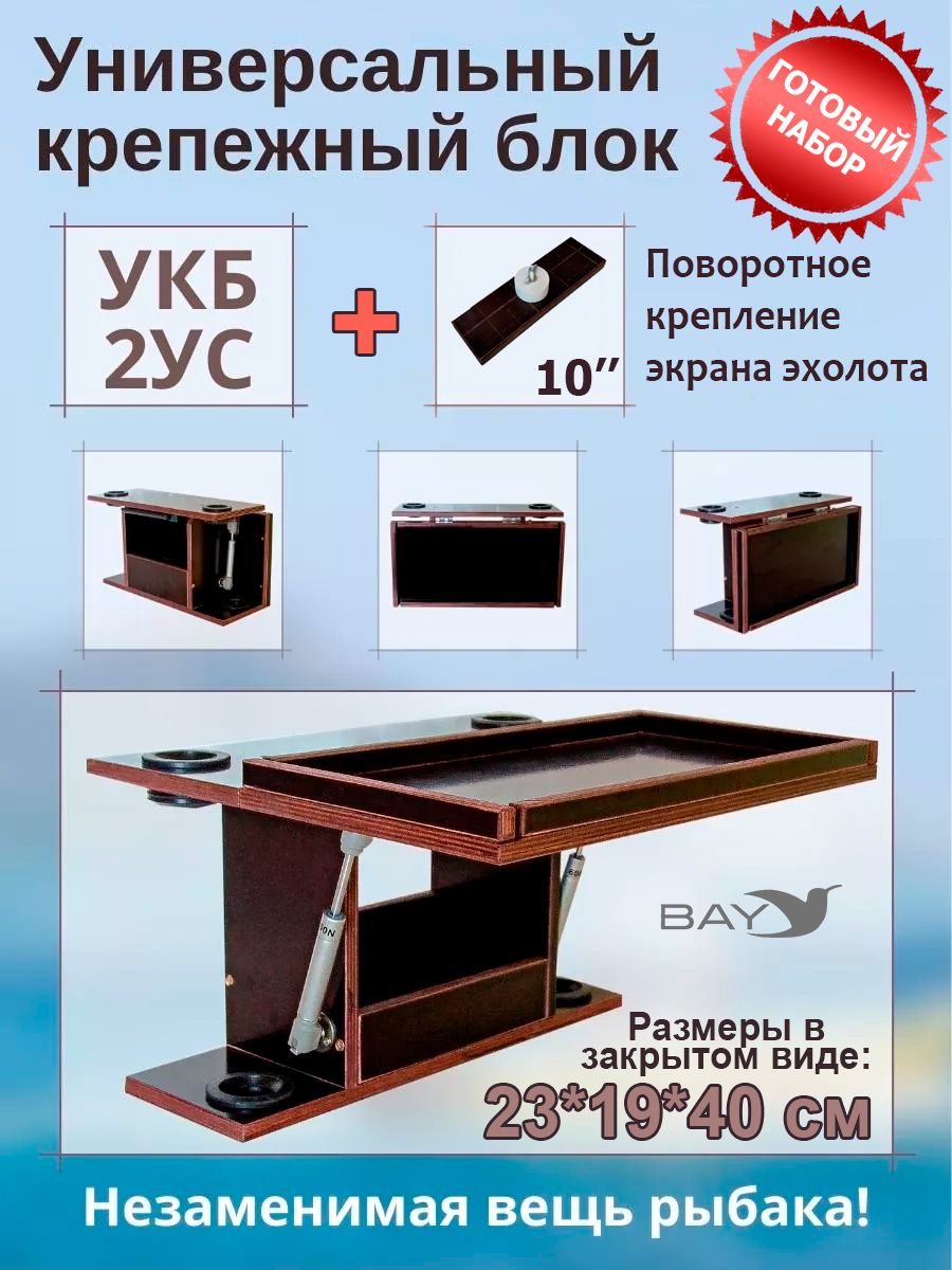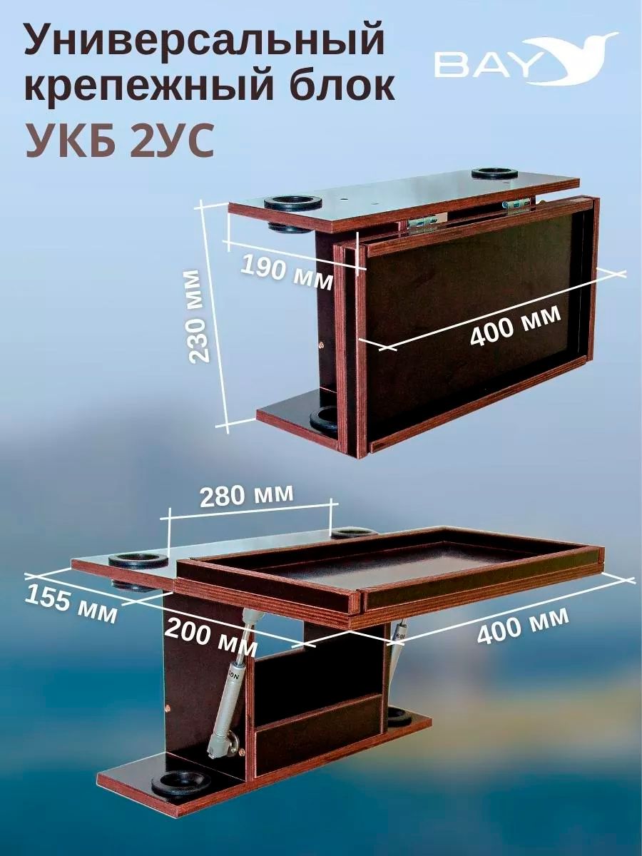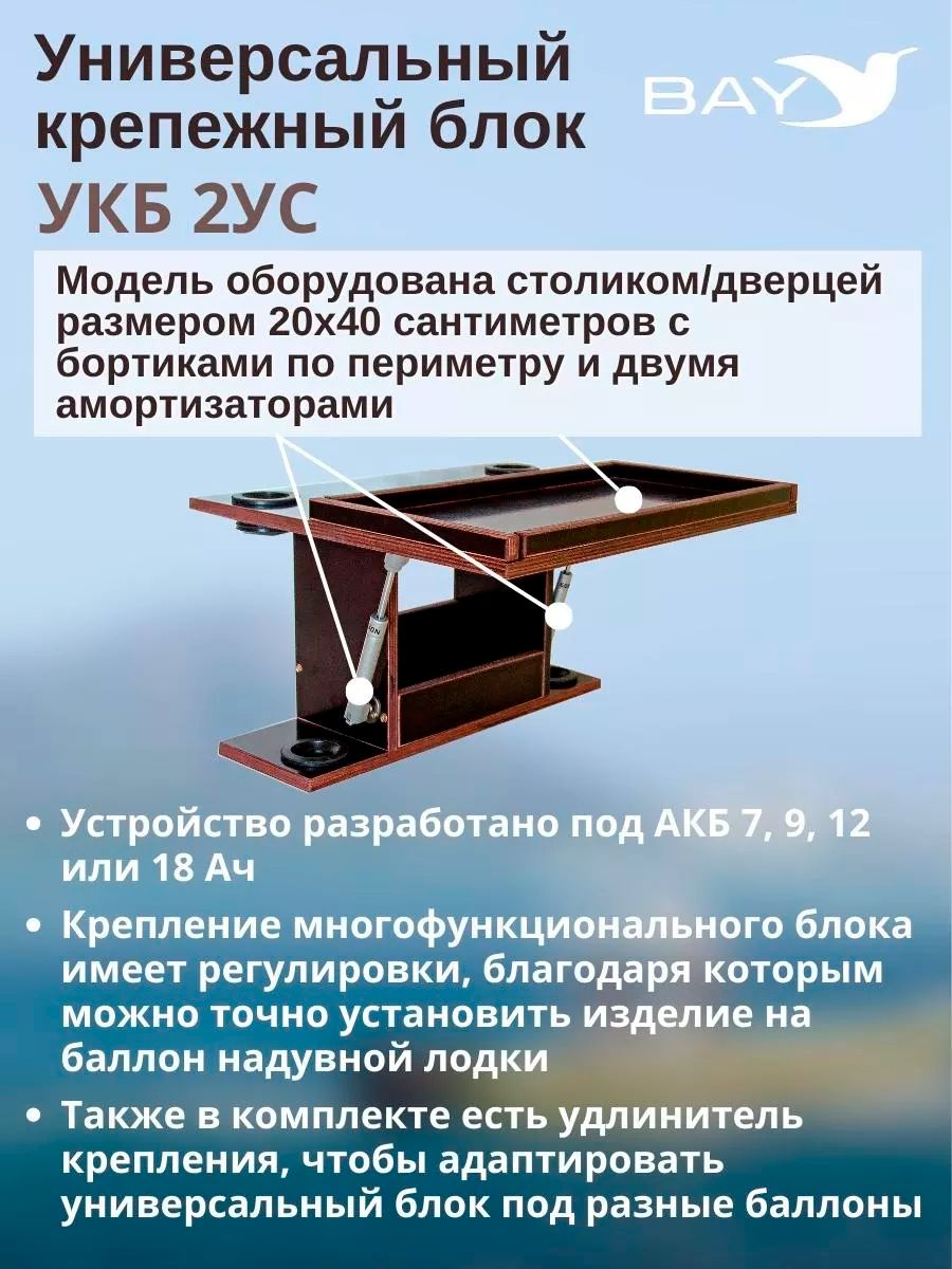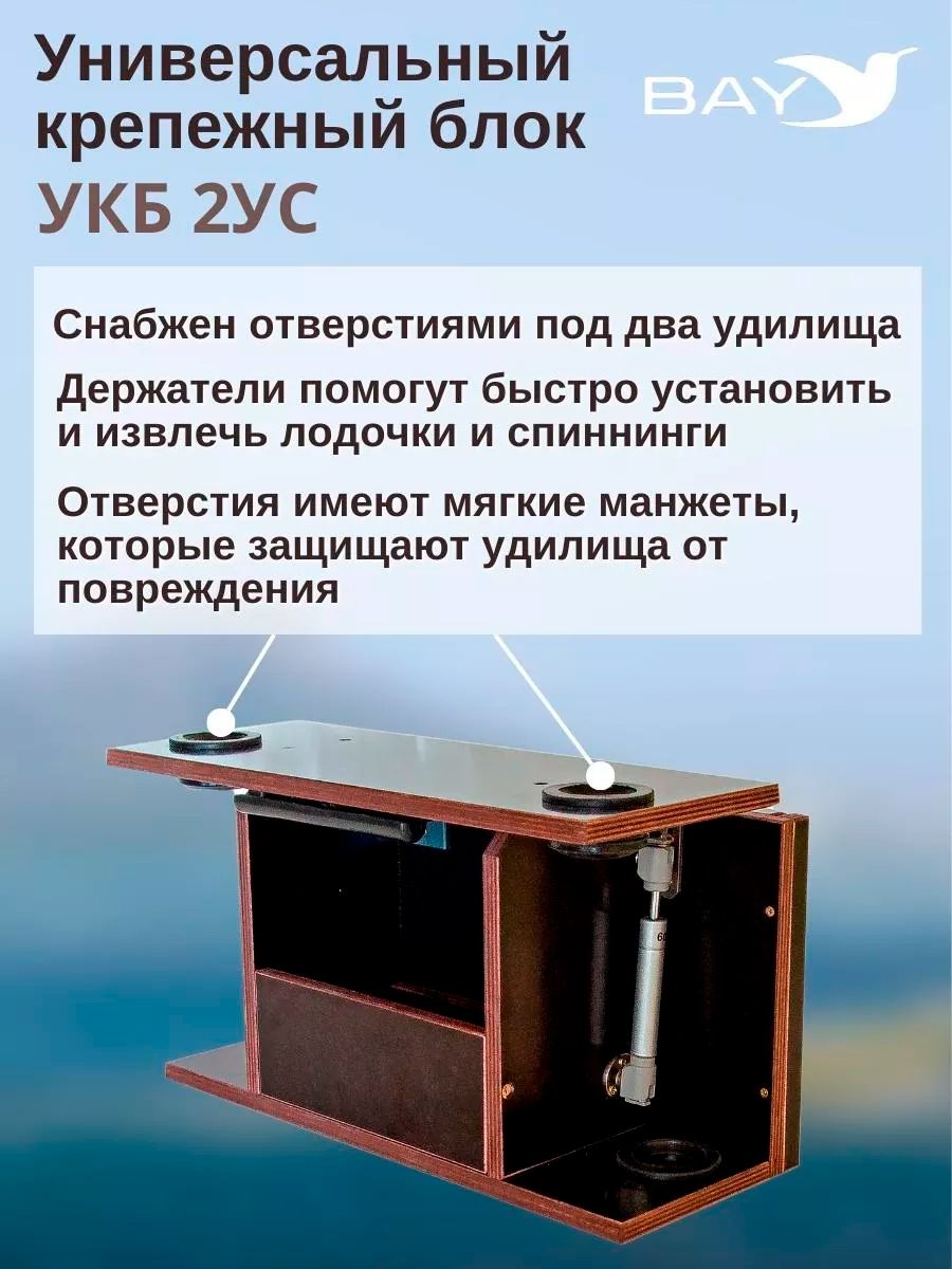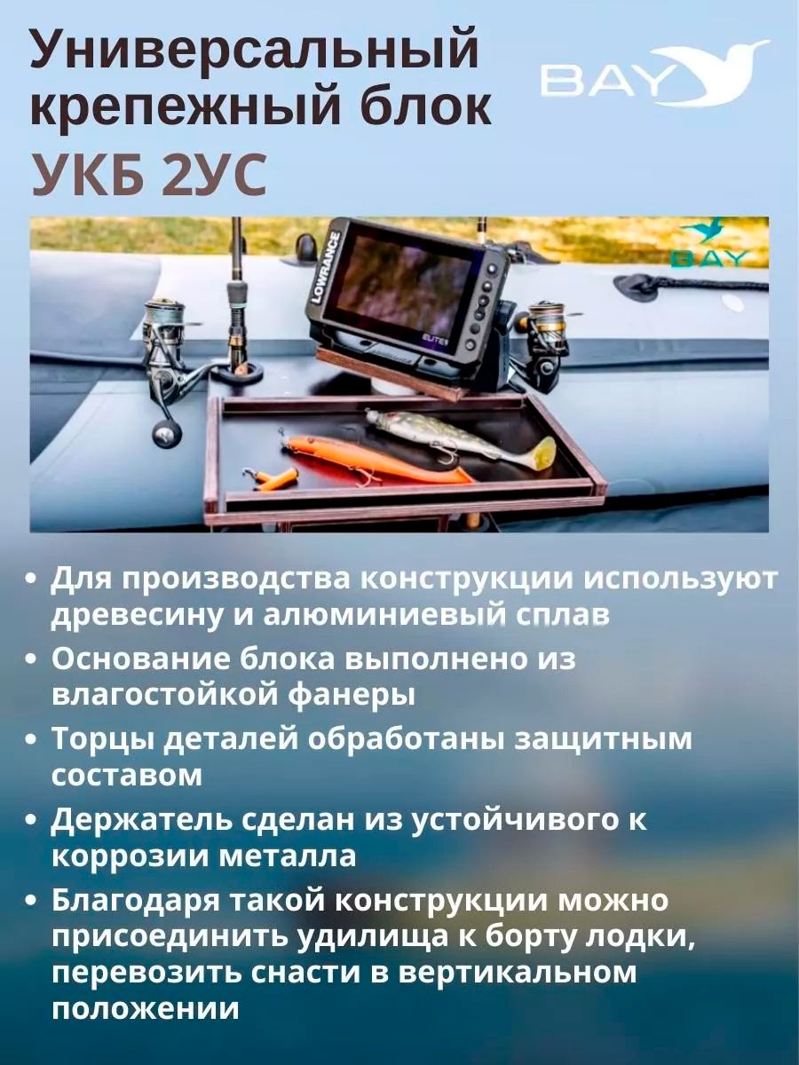 Универсальный крепежный блок (УКБ) с отверстиями под 2 удилища + столик/дверца УКБ 2УС - это многофункциональная конструкция, выполненная из водостойкой фанеры, которая позволяет удобно зафиксировать эхолот (картплоттер, навигатор), два спиннинга или удочки и АКБ. Функциональная и универсальная вещь для Вашего комфорта.