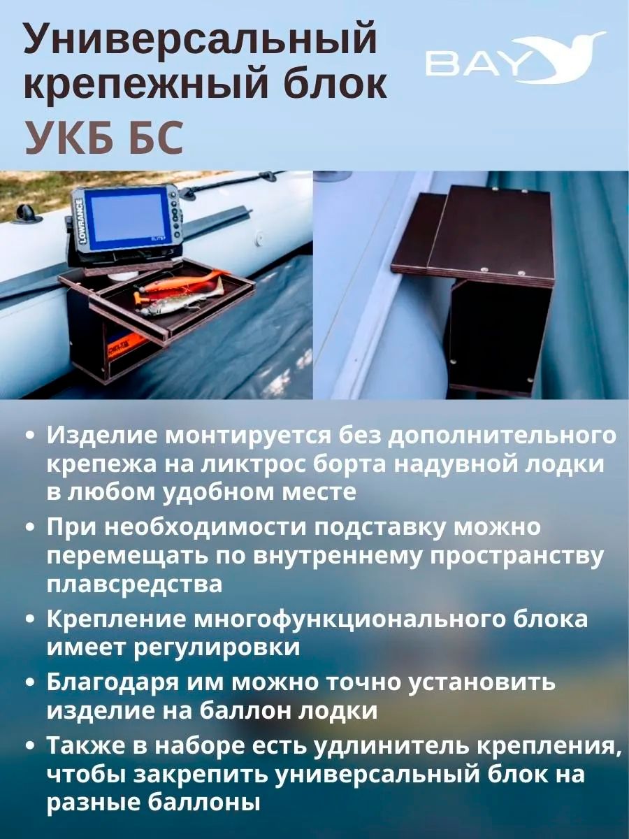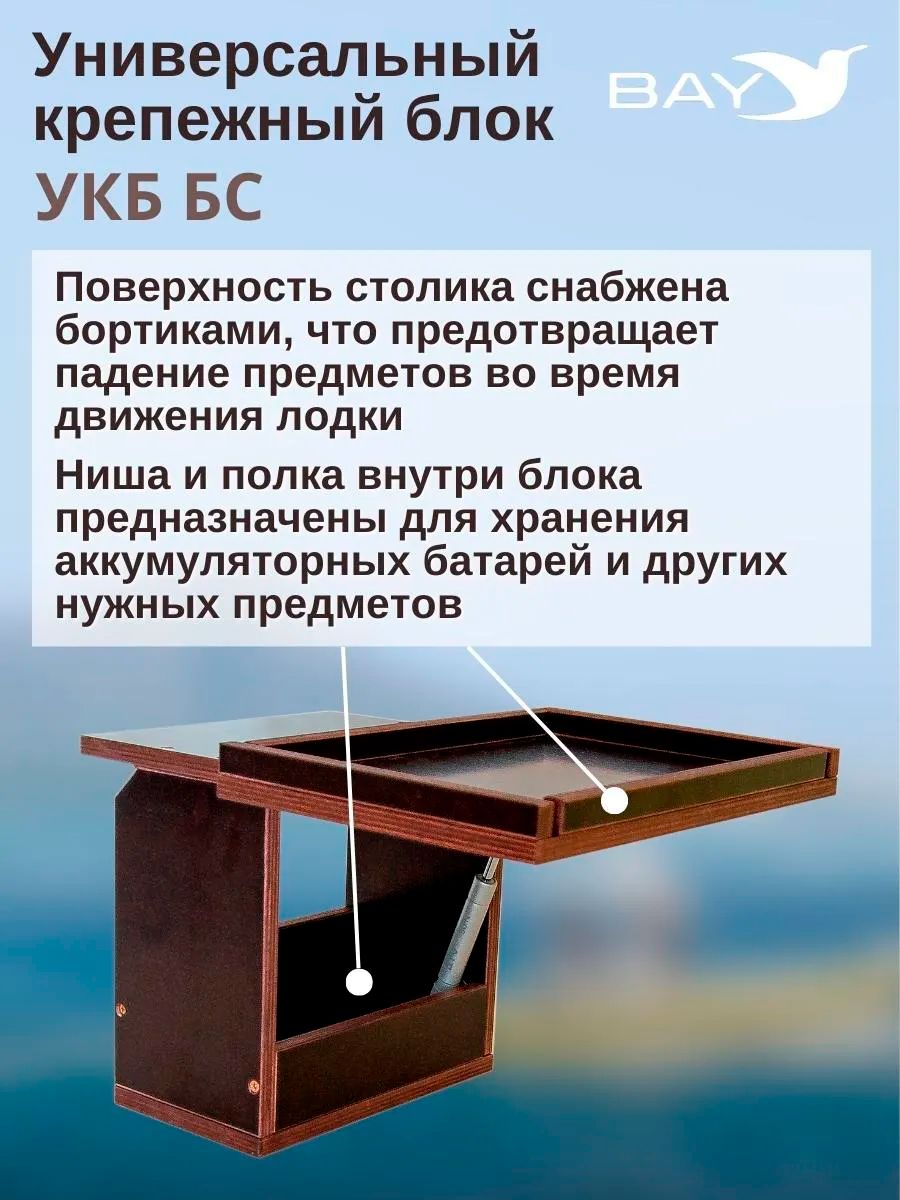 УКБ БС - это многофункциональная конструкция, выполненная из водостойкой фанеры, которая позволяет удобно зафиксировать эхолот (картплоттер, навигатор) и АКБ.
