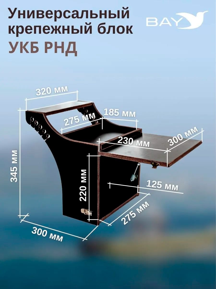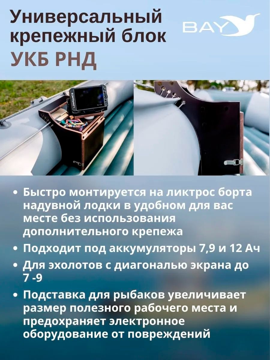 Универсальный крепежный блок BAY УКБ РНД - это многофункциональная конструкция выполненная из водостойкой фанеры 20 мм , которая позволяет удобно зафиксировать эхолот (картплоттер навигатор) и АКБ. Универсальная вещь для Вашего комфорта. У подставки есть 5 прорезей для крепления на разные баллоны диаметр от 40 до 50 см. У модели есть один амортизатор на открывающейся дверце, а так же бортики по периметру стола. Быстро монтируется на ликтрос борта надувной лодки в удобном для вас месте, без использования дополнительного крепежа.