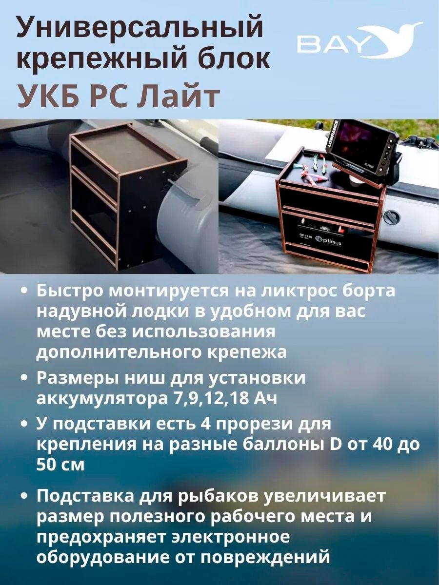 Универсальный крепежный блок ВАУ УКБ РС лайт - это многофункциональная конструкция выполненная из водостойкой фанеры 20 мм которая позволяет удобно зафиксировать эхолот (картплоттер навигатор) и АКБ. Универсальная вещь для Вашего комфорта. У подставки есть 4 прорези для крепления на разные баллоны D от 40 до 50 см. Модель облегченная и не имеет открывающейся дверцы. Есть бортики по периметру столика. Быстро монтируется на ликтрос борта надувной лодки. в удобном для Вас месте, без использования дполнительного крепежа
