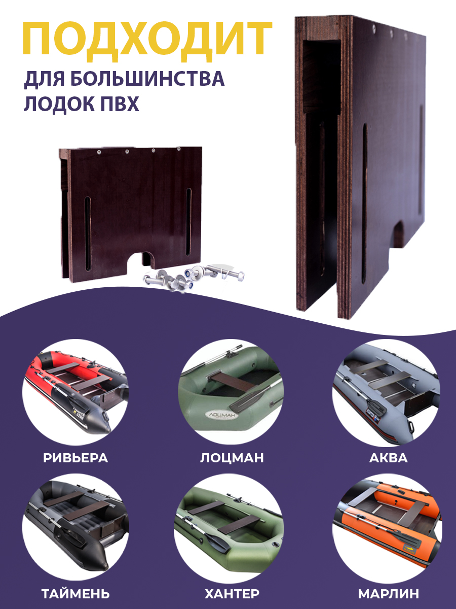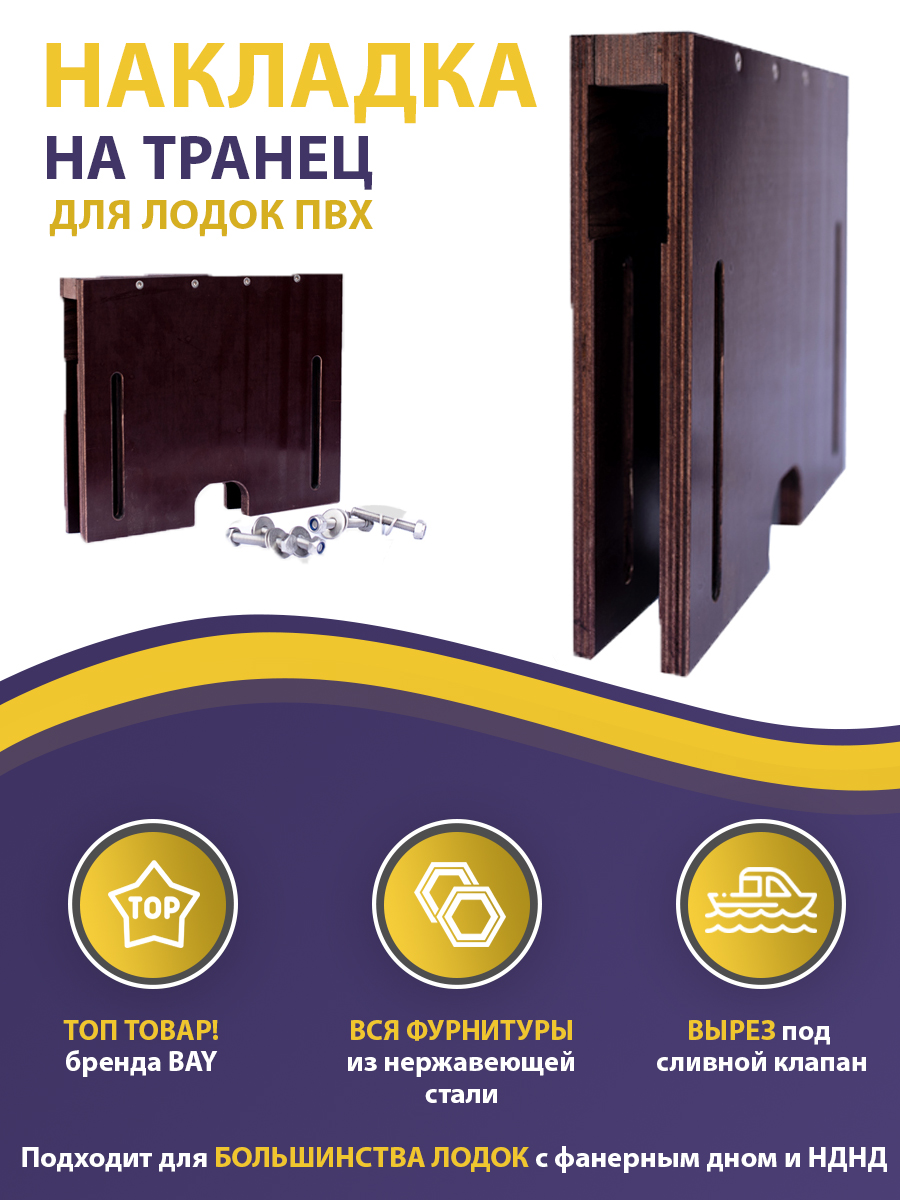 Универсальная накладка на транец, за счёт выреза под сливной клапан подходит как для пайолных так и для НДНД лодок. Изготавливается в нескольких типоразмерах под разную толщину транца: 18, 21, 24, 27 или 32 мм.