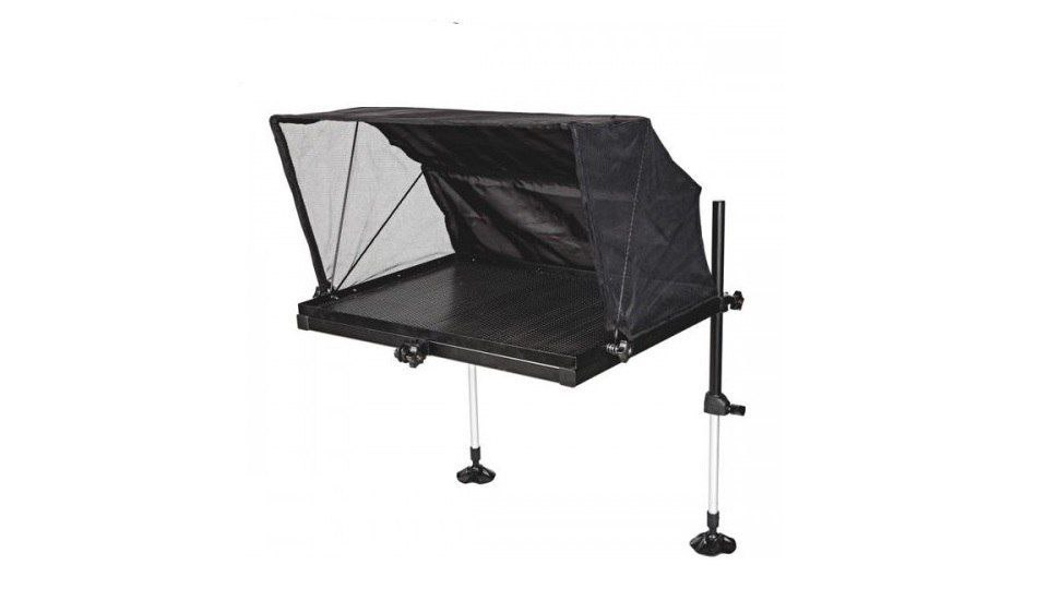 Перфорированный стол со шторкой отлично защищает приманки и аксессуары во время дождя, боковых ветров и сильного солнечного света.