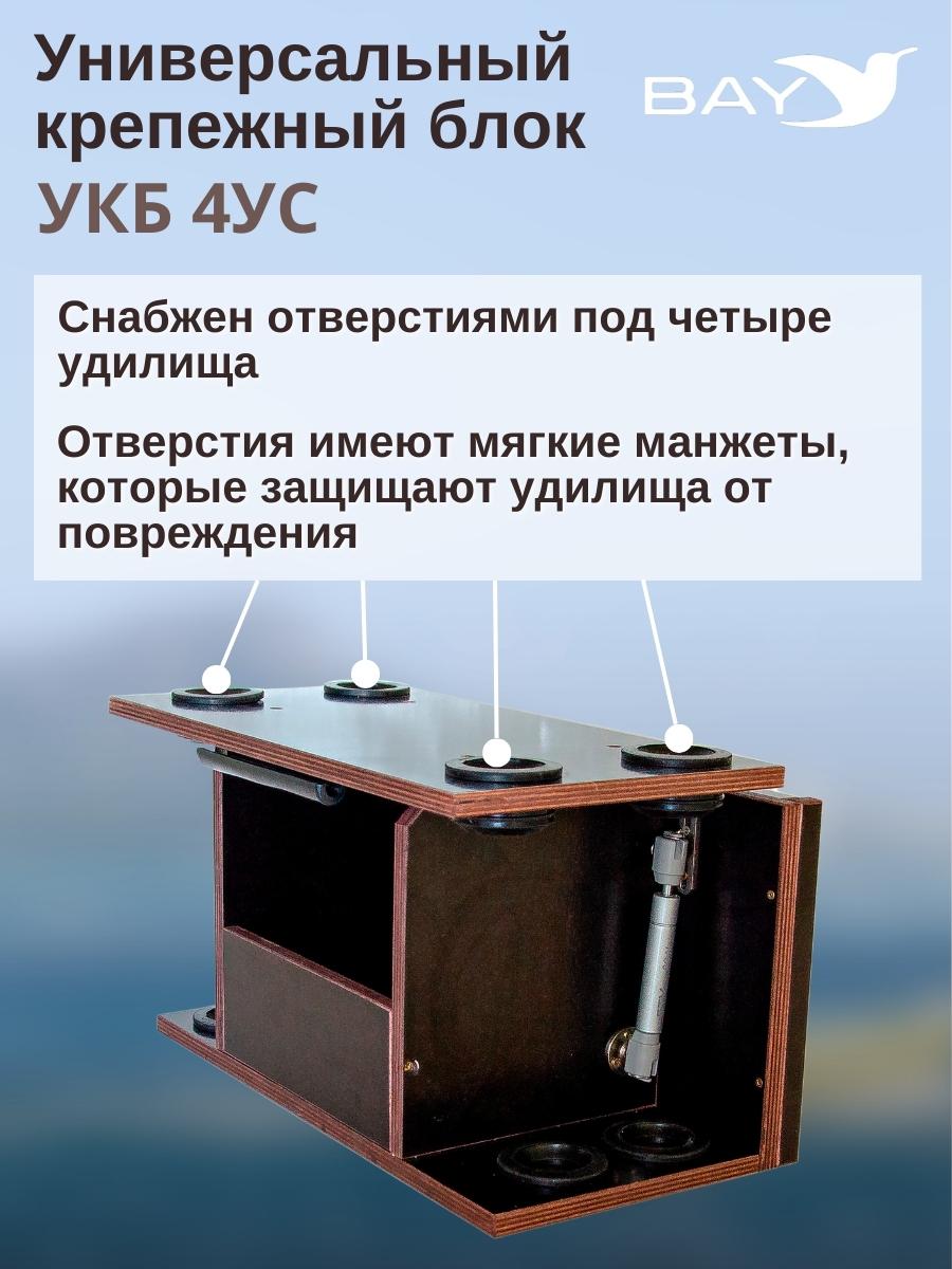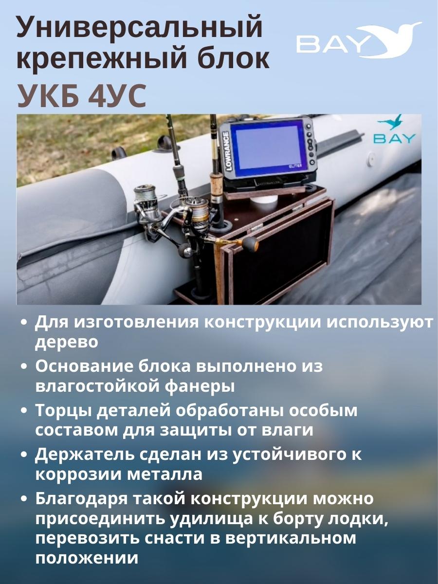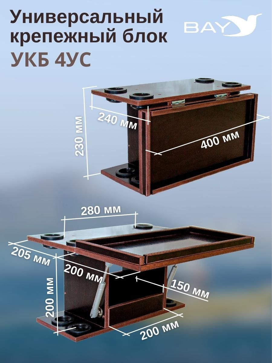 УКБ с отверстиями под 4 удилища + столик/дверца (УКБ 4УС) - это многофункциональная конструкция, выполненная из водостойкой фанеры, которая позволяет удобно зафиксировать эхолот (картплоттер, навигатор), четыре спиннинга или удочки и установить АКБ.