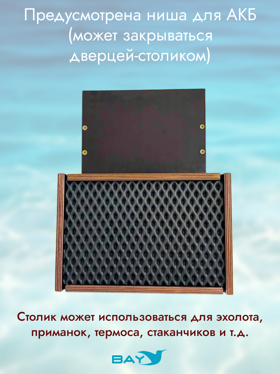 Предусмотрена ниша для АКБ, состоящая из двух отсеков (может закрываться дверцей-столиком) и площадка для монитора эхолота. Столик может использоваться для эхолота, приманок, термоса, стаканчиков и т.д.