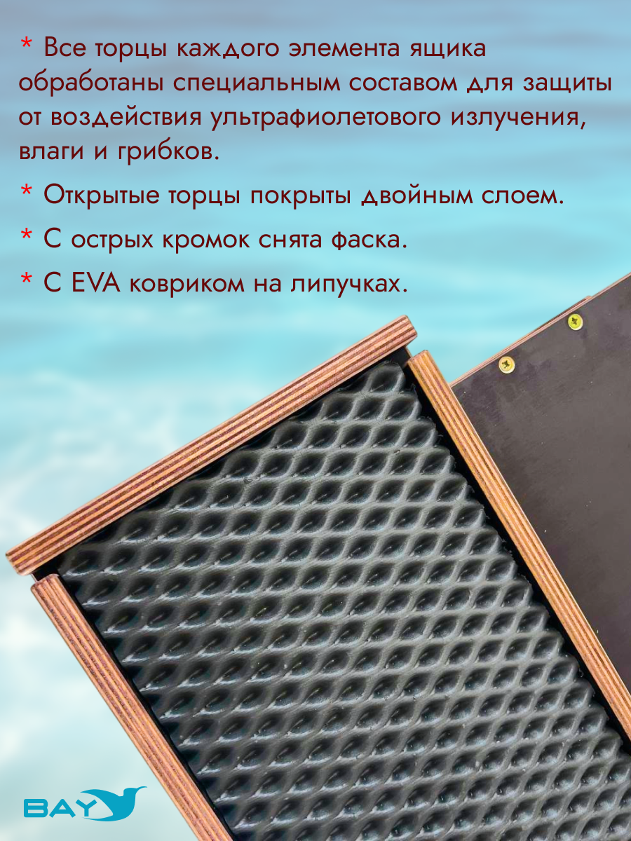 * Все торцы каждого элемента ящика обработаны специальным составом для защиты от воздействия ультрафиолетового излучения, влаги и грибков.