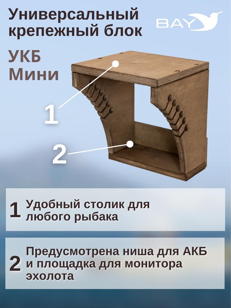 Универсальный крепежный блок УКБ Мини - это многофункциональная конструкция, выполненная из водостойкой фанеры 20 мм, которая позволяет удобно зафиксировать эхолот (картплоттер, навигатор) и АКБ. Функциональная и универсальная вещь для Вашего комфорта.
