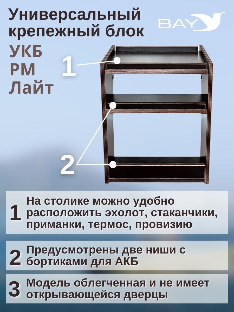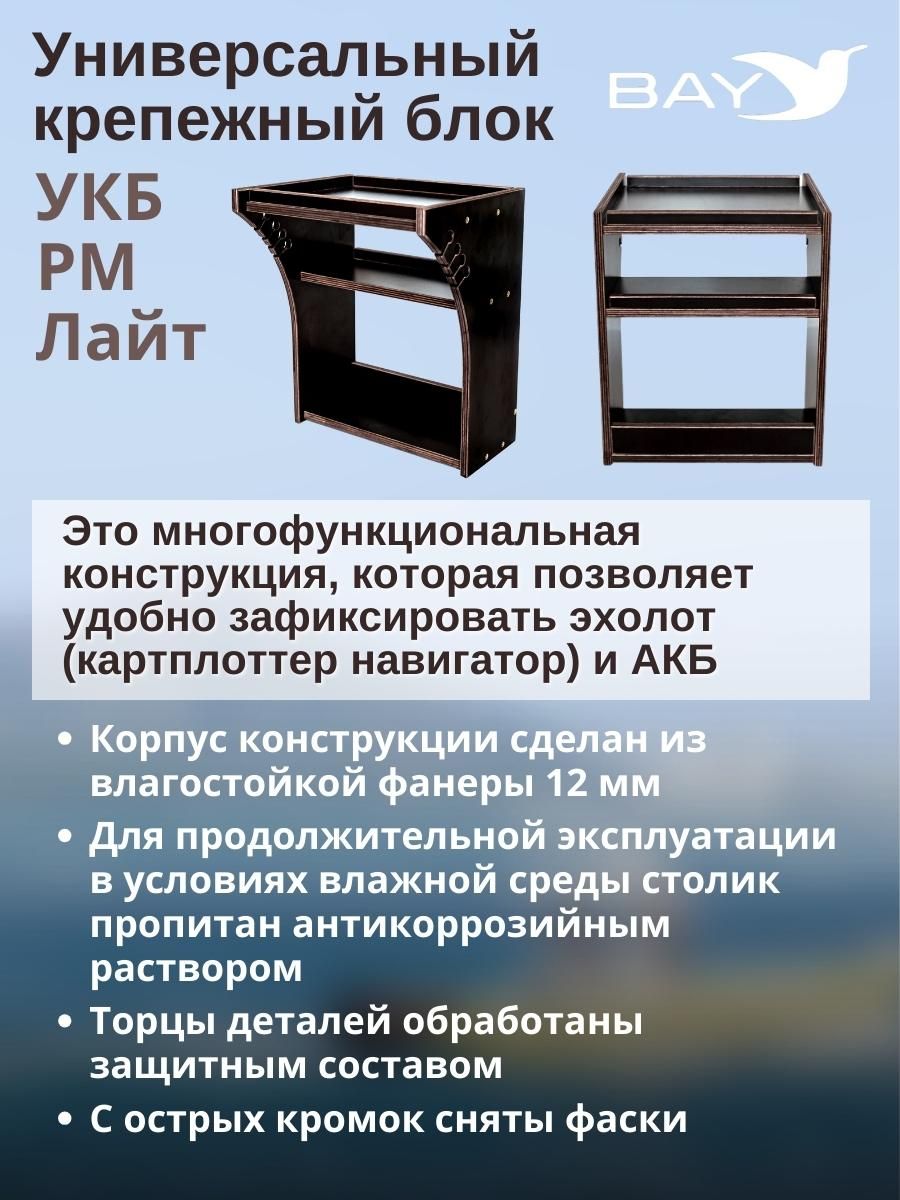 Универсальный крепежный блок УКБ РМ Лайт - это многофункциональная конструкция, выполненная из водостойкой фанеры 20 мм, которая позволяет удобно зафиксировать эхолот (картплоттер, навигатор) и АКБ. Функциональная и универсальная вещь для Вашего комфорта.