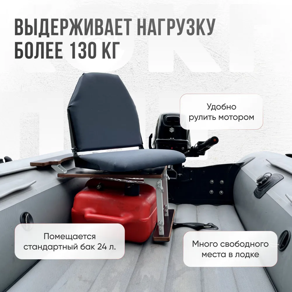 - Под стойку помещается стандартный бак 24 литра (Yamaha, Tohatsu, Suzuki и аналоги).