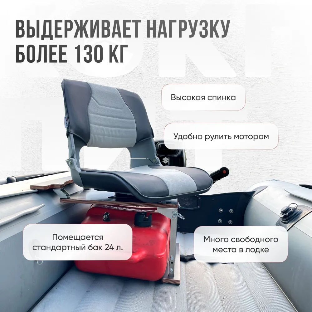 - Под стойку помещается стандартный бак 24 литра (Yamaha, Tohatsu, Suzuki и аналоги).