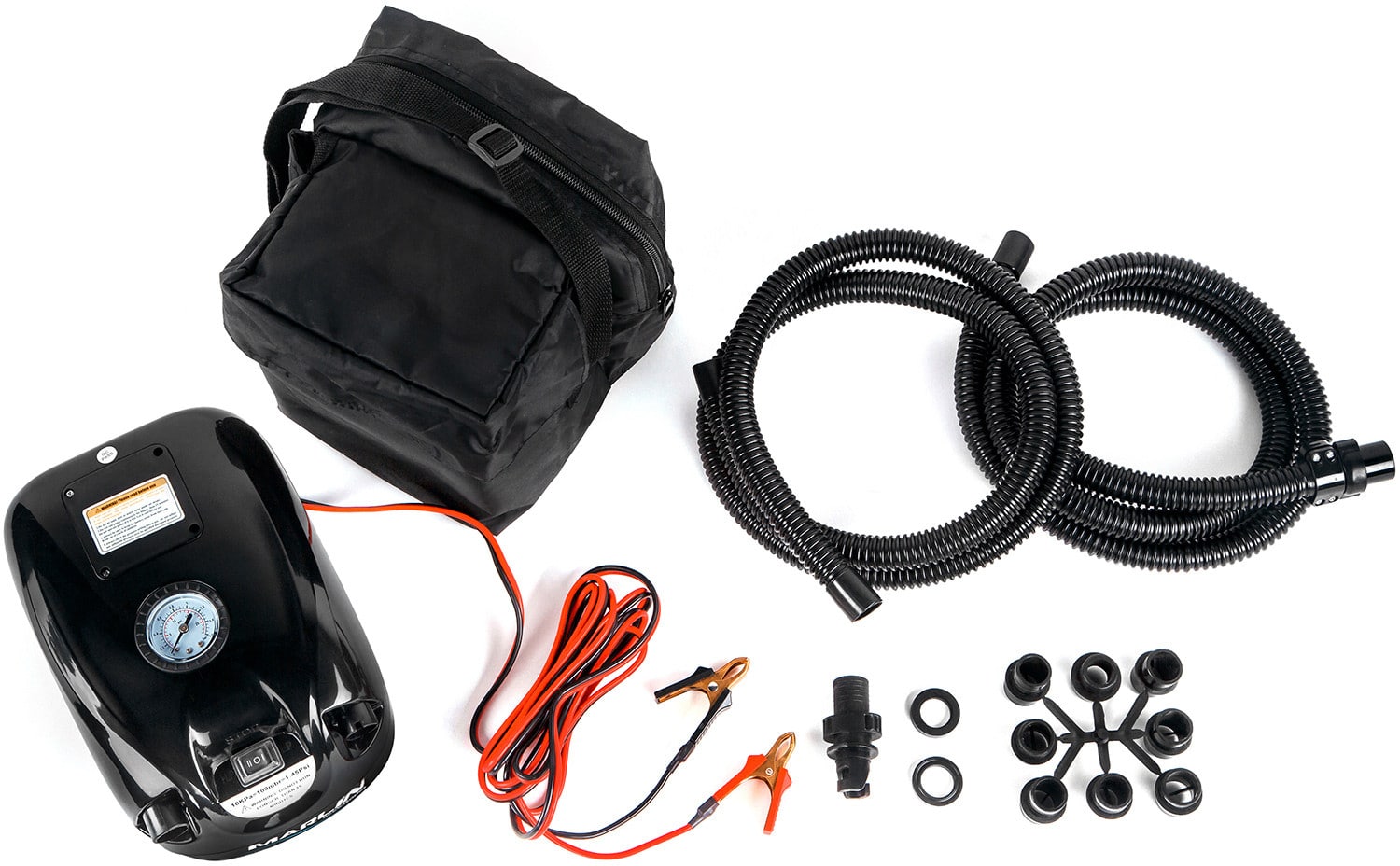 Подходит для накачивания надувных лодок ПВХ (в комплекте поставки – адаптер под вворачиваемый клапан и 9 переходников под воздушные клапаны различных диаметров).