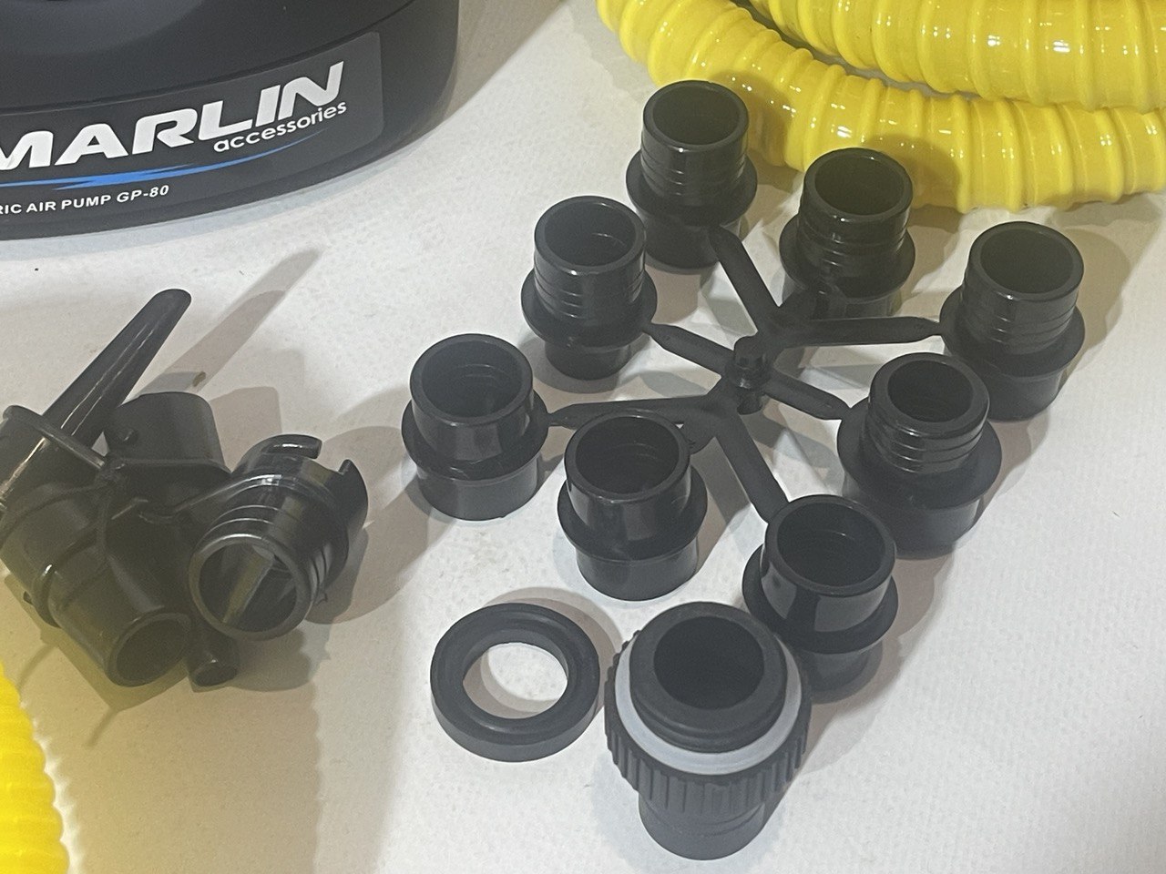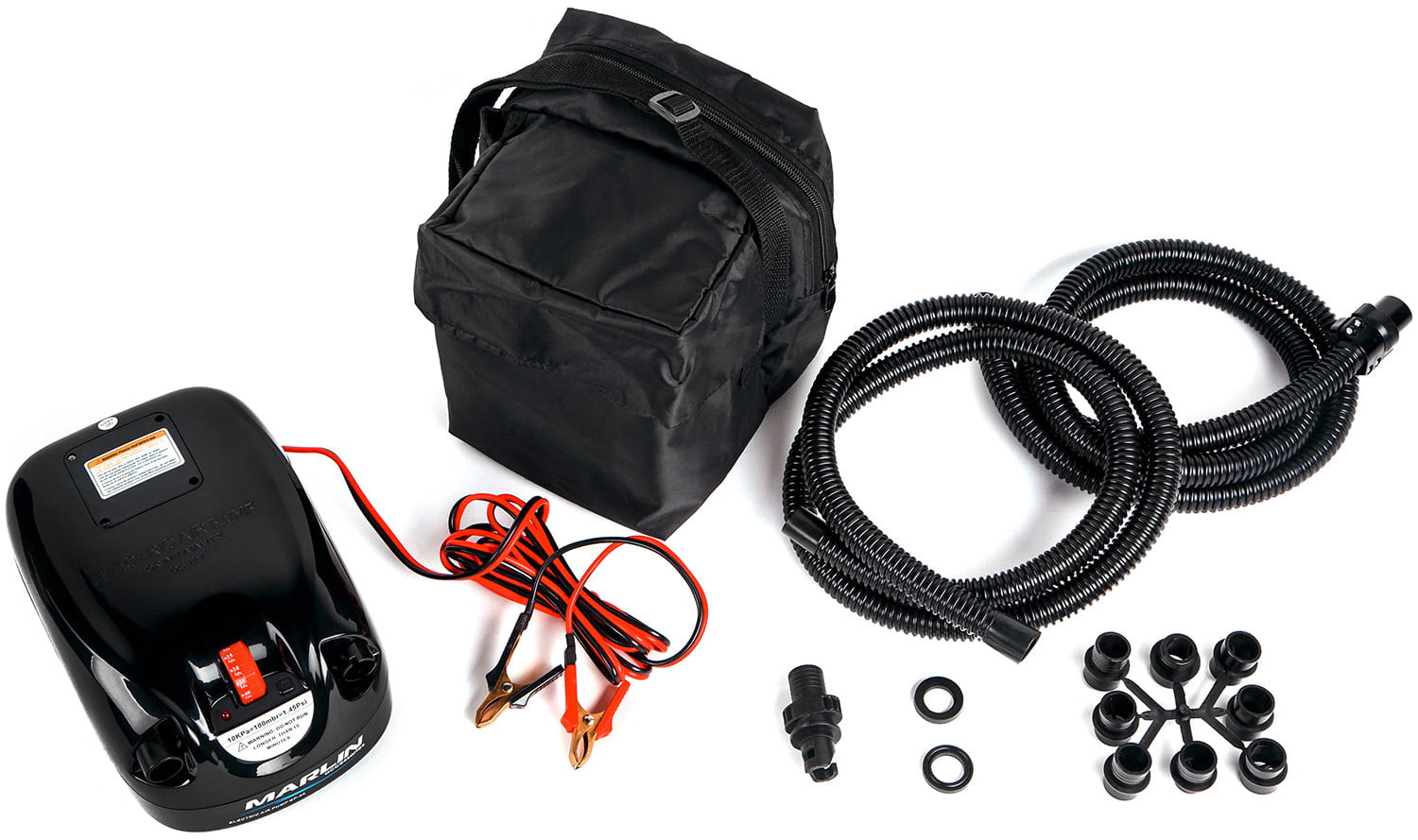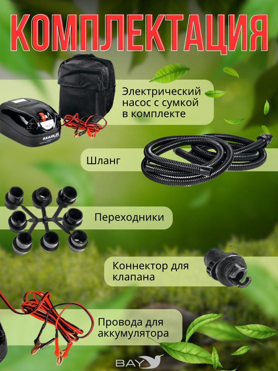 Подходит для накачивания надувных лодок ПВХ (в комплекте поставки – адаптер под вворачиваемый клапан и 9 переходников под воздушные клапаны различных диаметров).