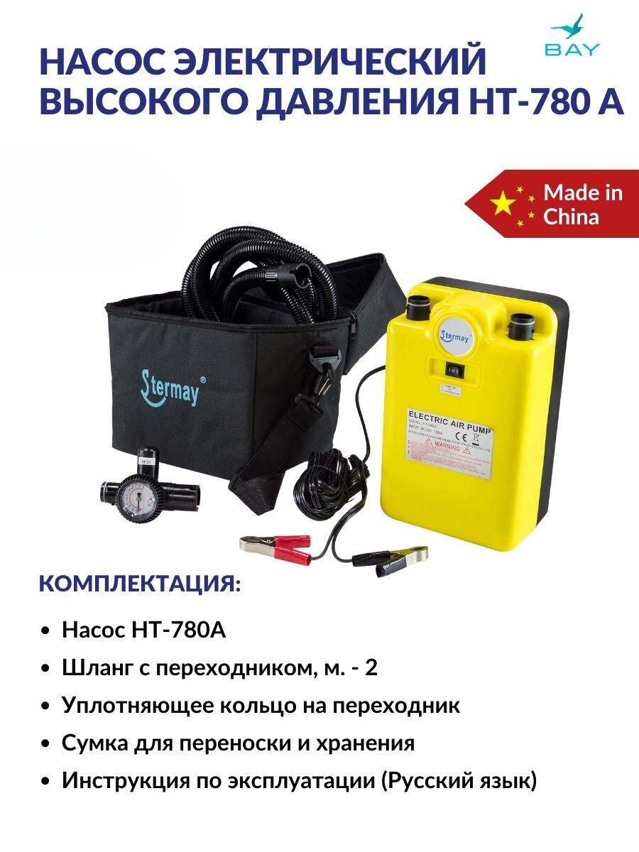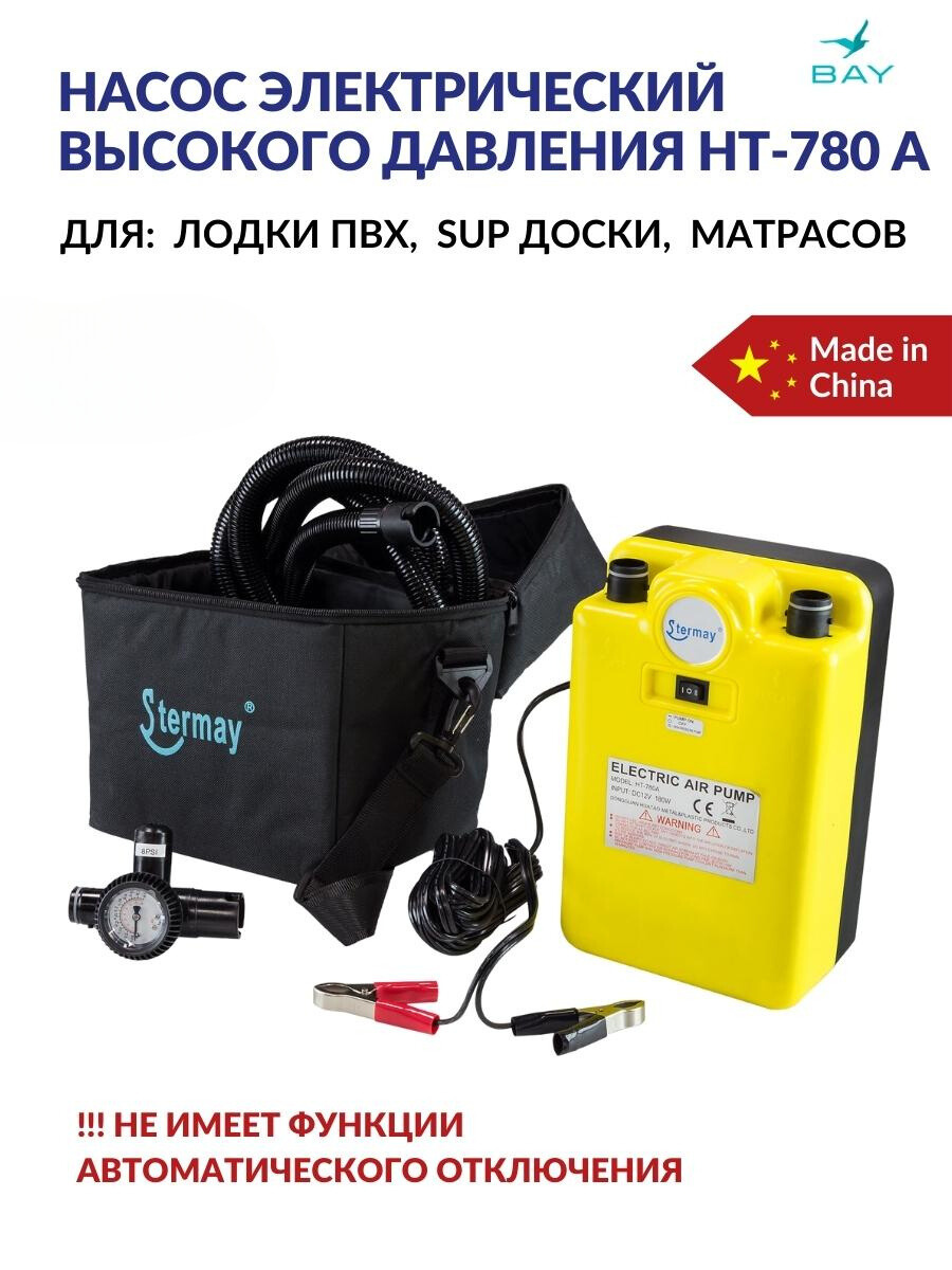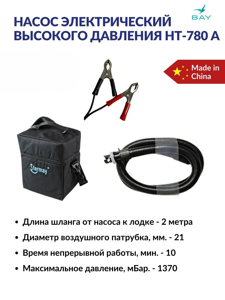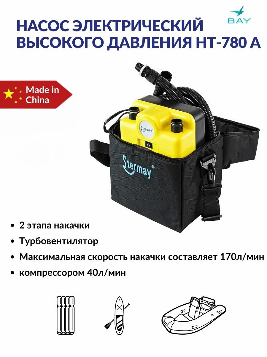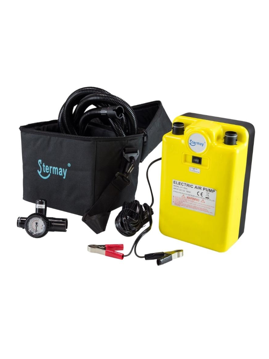 Насос электрический двухступенчатый высокого давления. Предназначен для быстрой накачки надувных лодок. Этот насос позволяет ускорить процесс складывания лодки, достаточно переставить шланг из выпускного отверстия насоса во впускное, и включить питание.